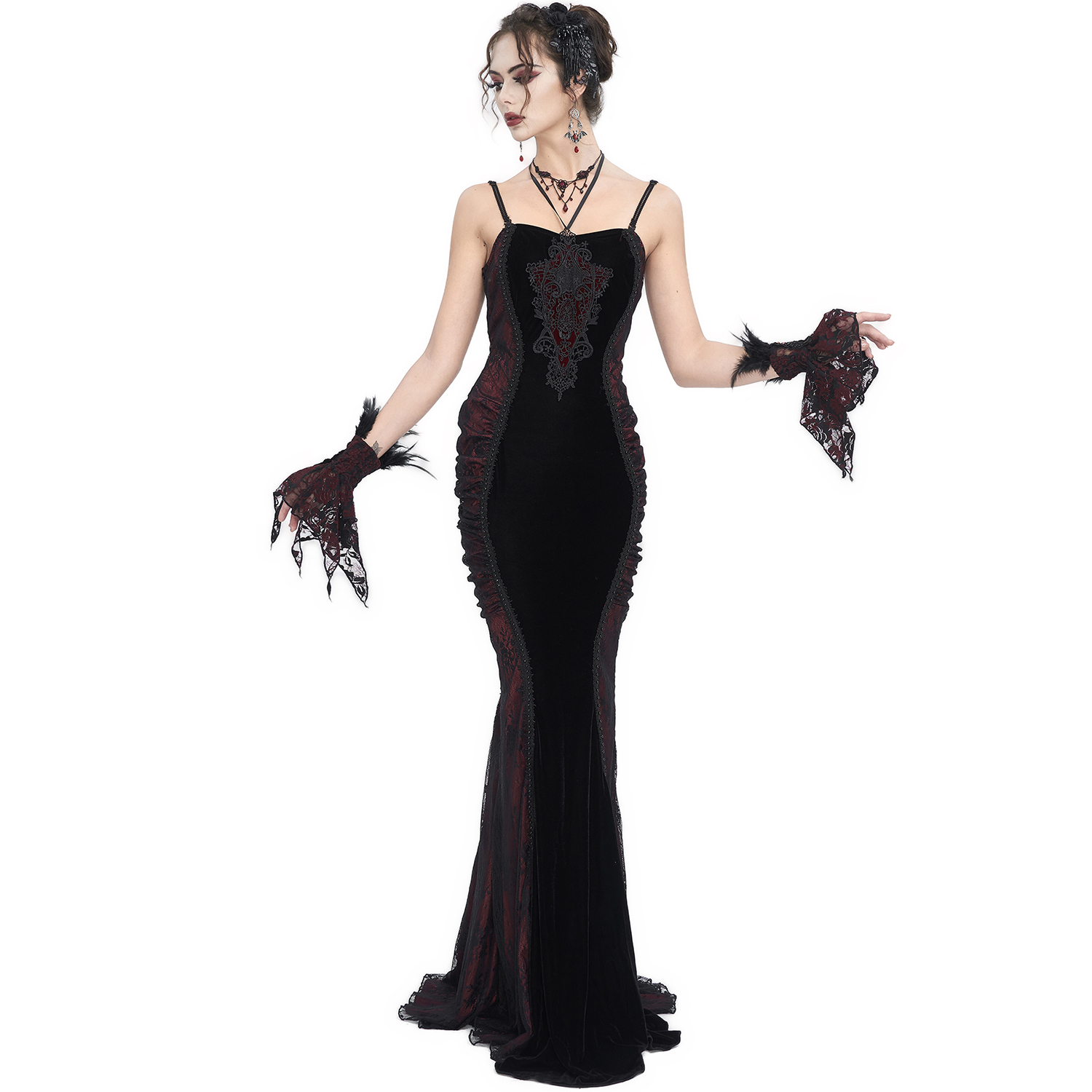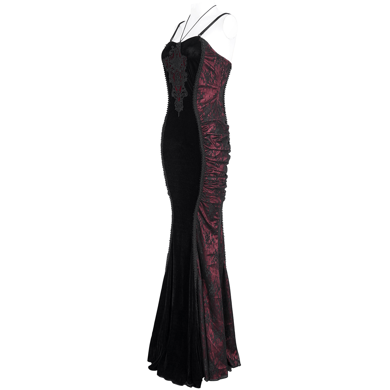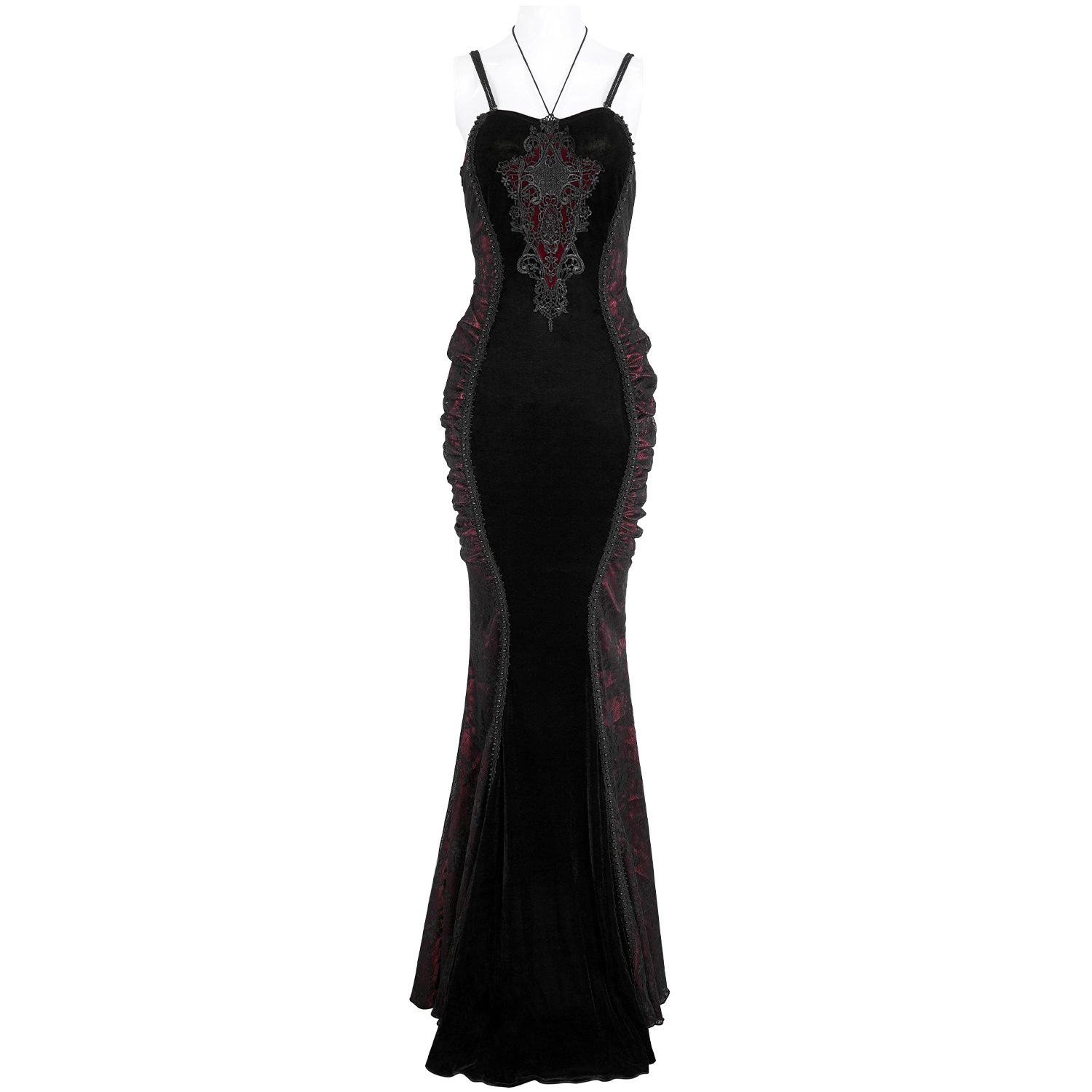 • En velours noir dense et extensible • Épaules dénudées • Applique de dentelles en forme de V avec laçage réglable sur la poitrine • Ourlet symétrique de la jupe conçu avec des couches...