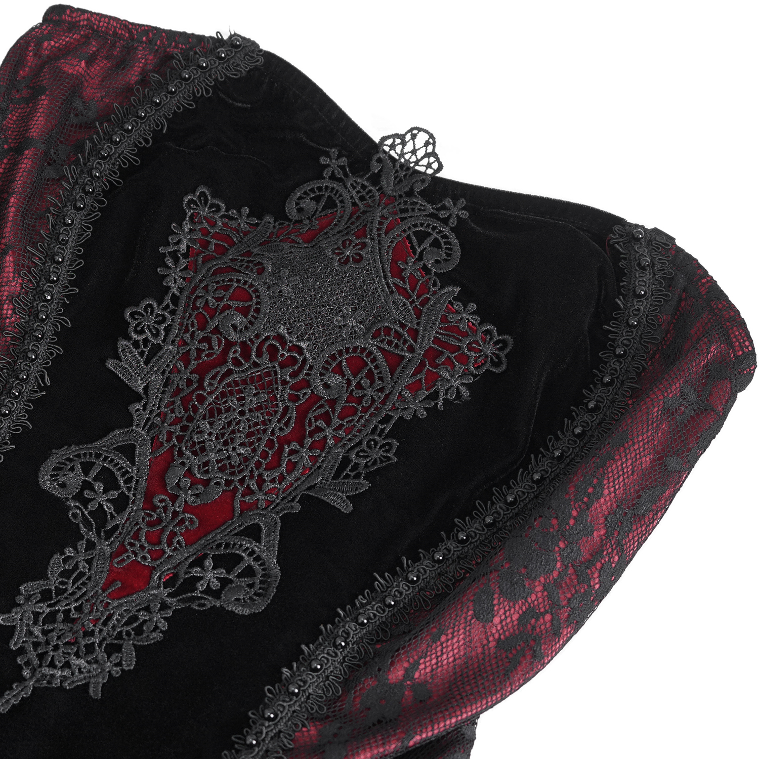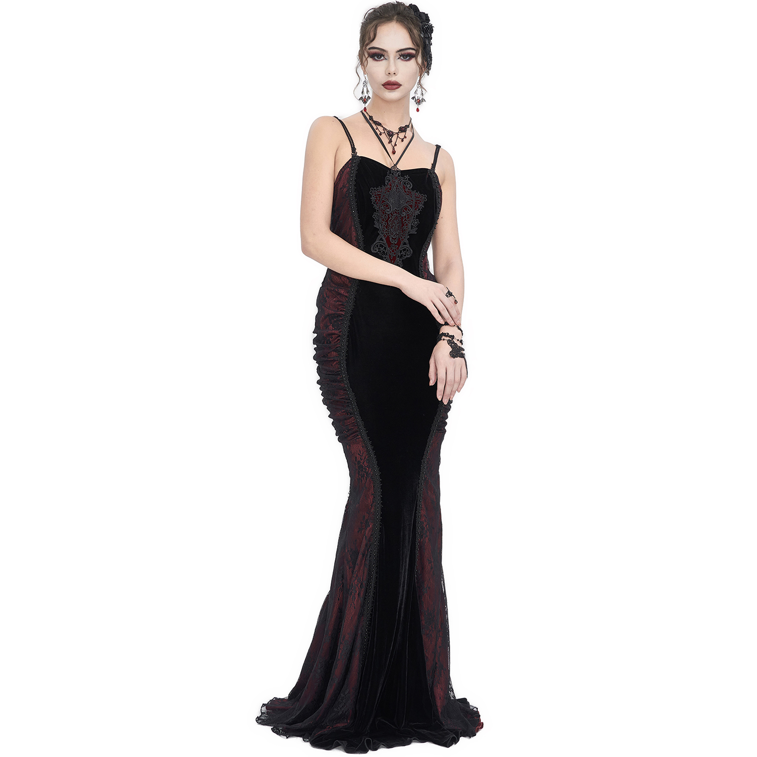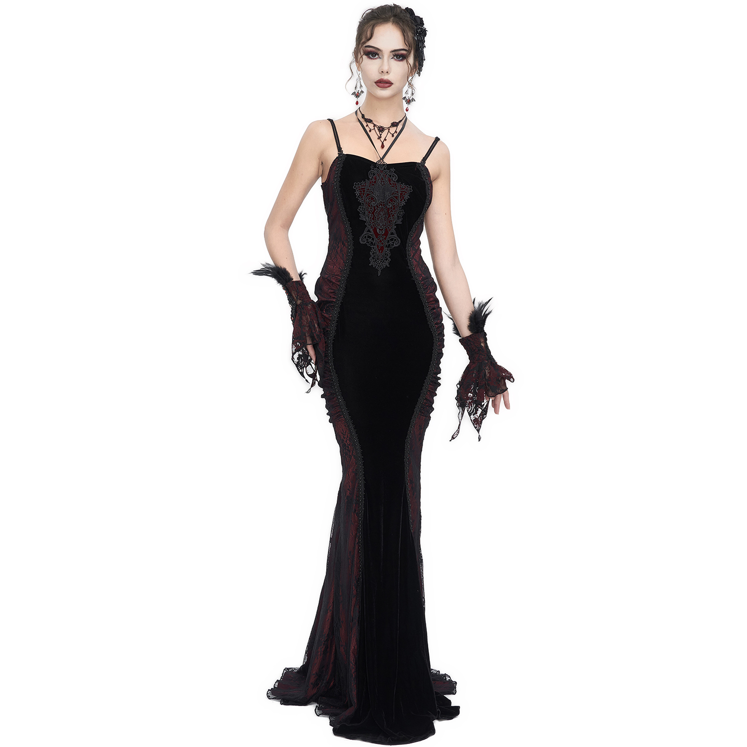 • En velours noir dense et extensible • Épaules dénudées • Applique de dentelles en forme de V avec laçage réglable sur la poitrine • Ourlet symétrique de la jupe conçu avec des couches...