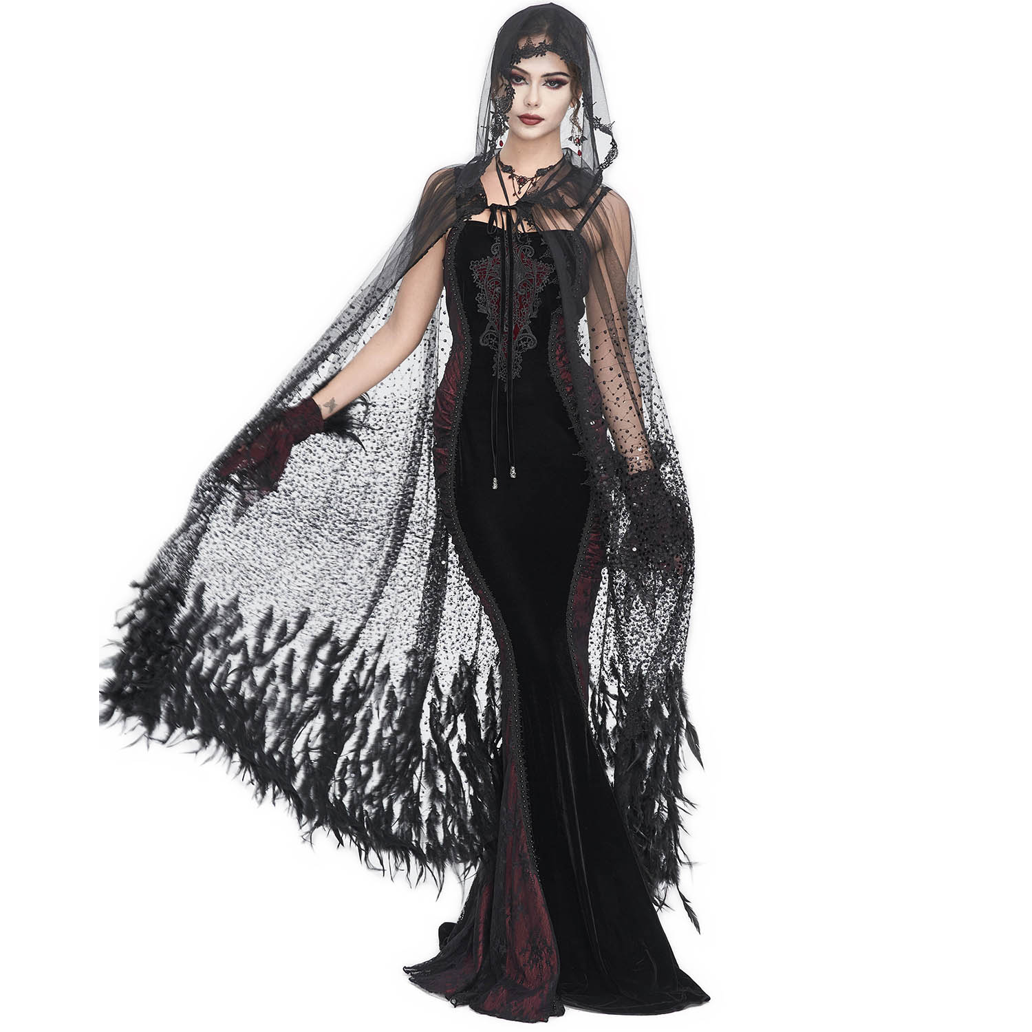 Robe longue à large cape et manches longues de style gothique victorien • Robe semi-ajustée avec un design orné de guipures brodées sur le devant • Cape extra longue et fluide, fixée aux...