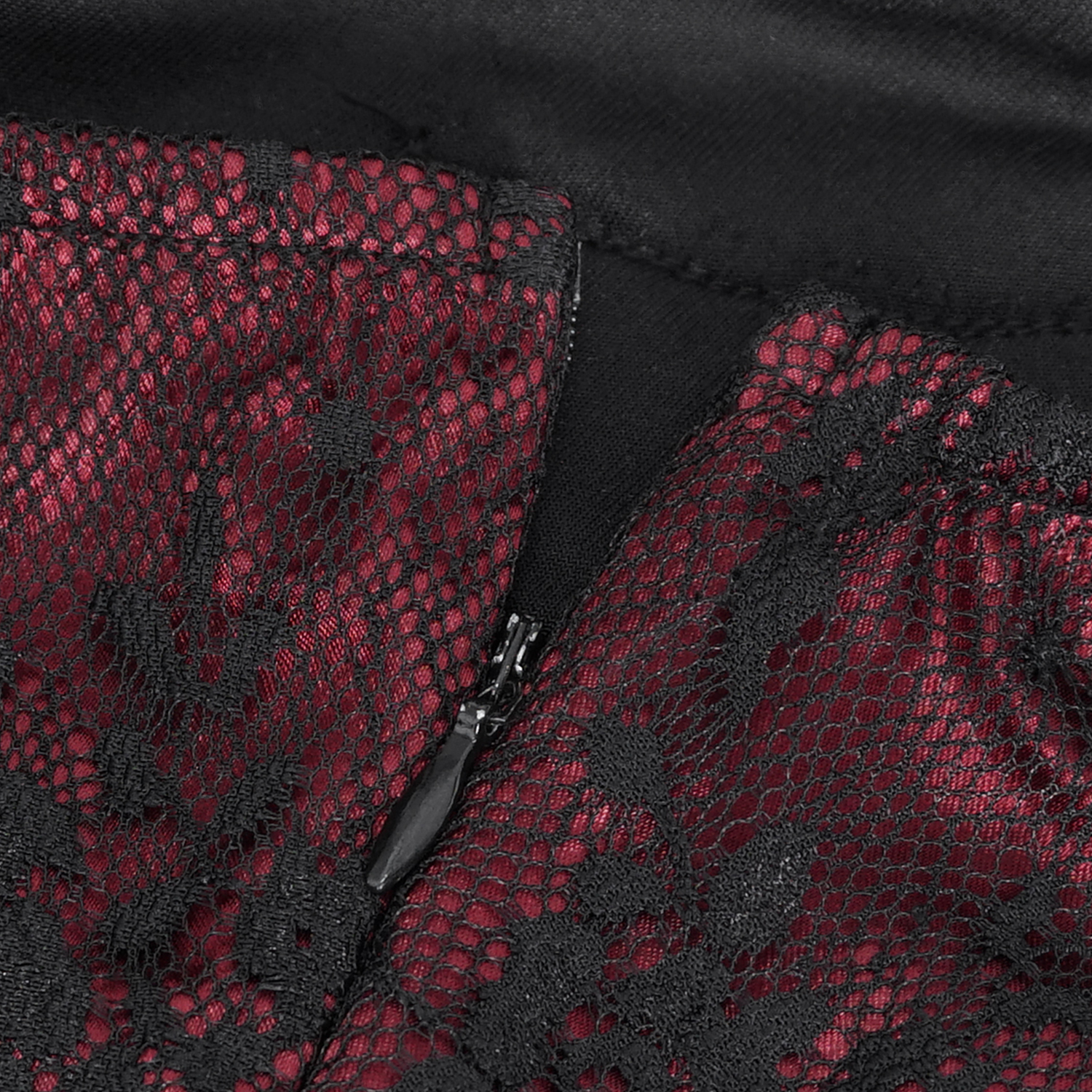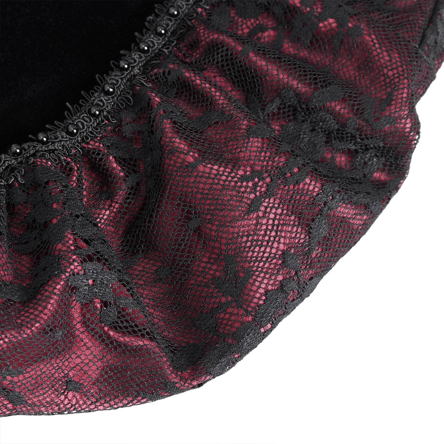 • Épissé par un filet de dentelle avec un tissu froncé bordeaux sur les côtés