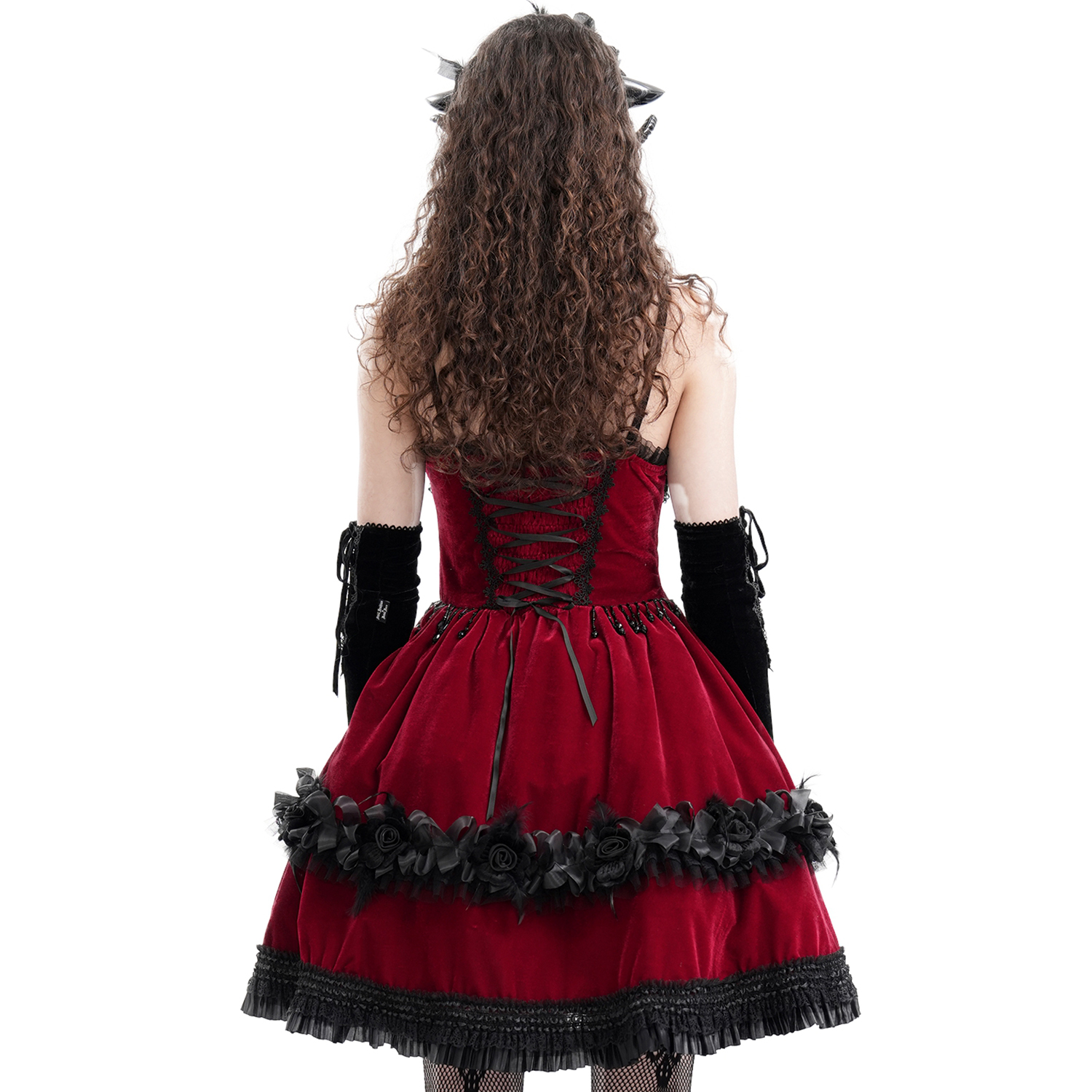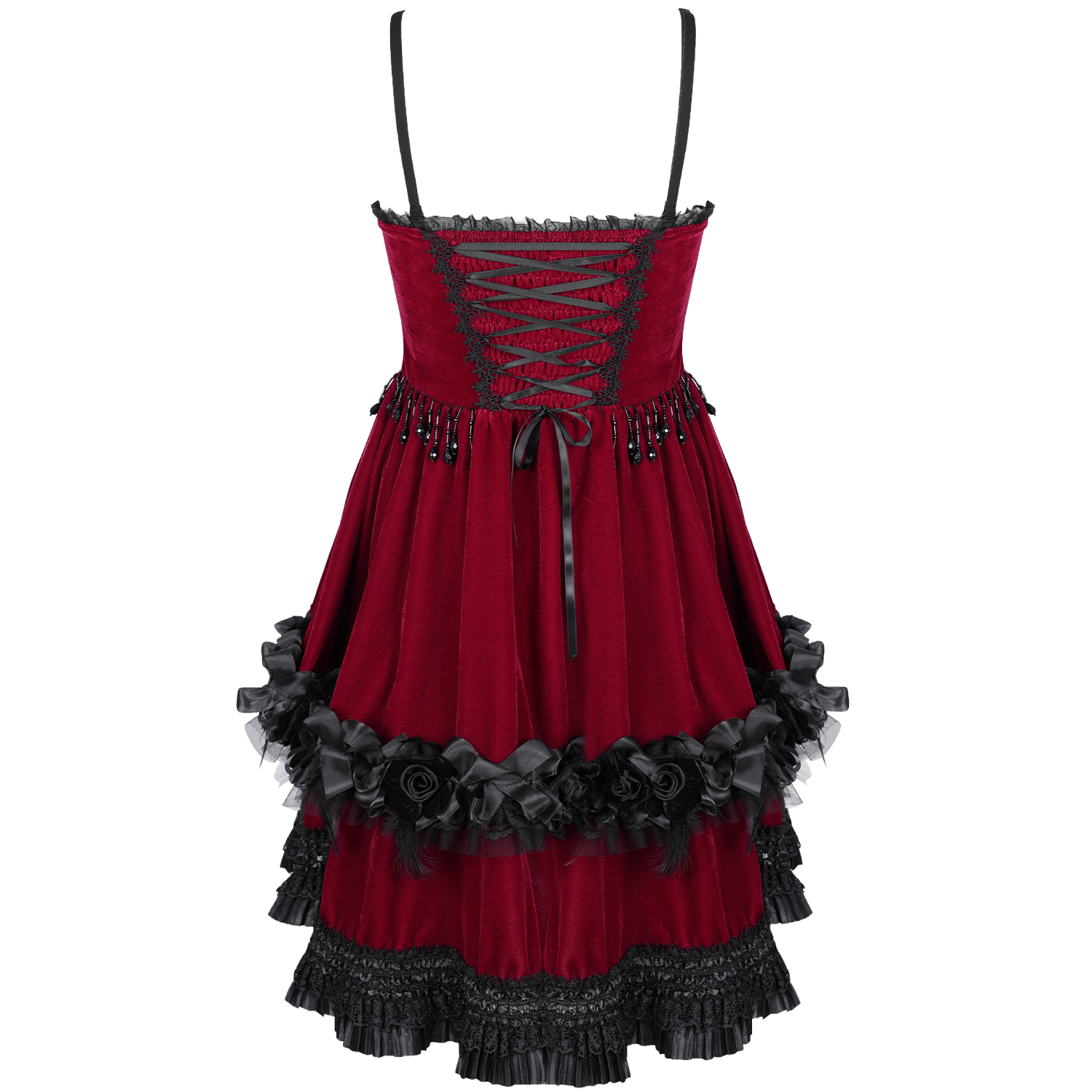 • Robe à bretelles en velours noir • Faux corset en tissu bordeaux et noir • Roses 3D agrémentées de perles blanches • Perles noires tombantes sur le bas du corset • Boutons métalliques...