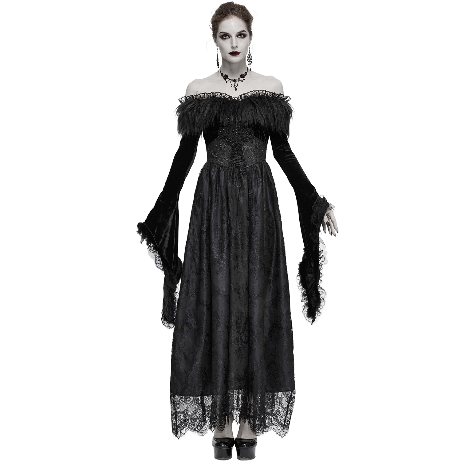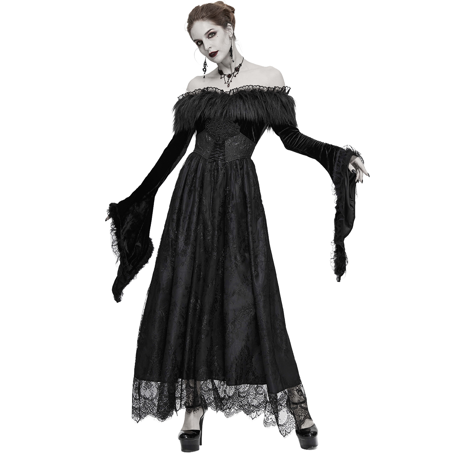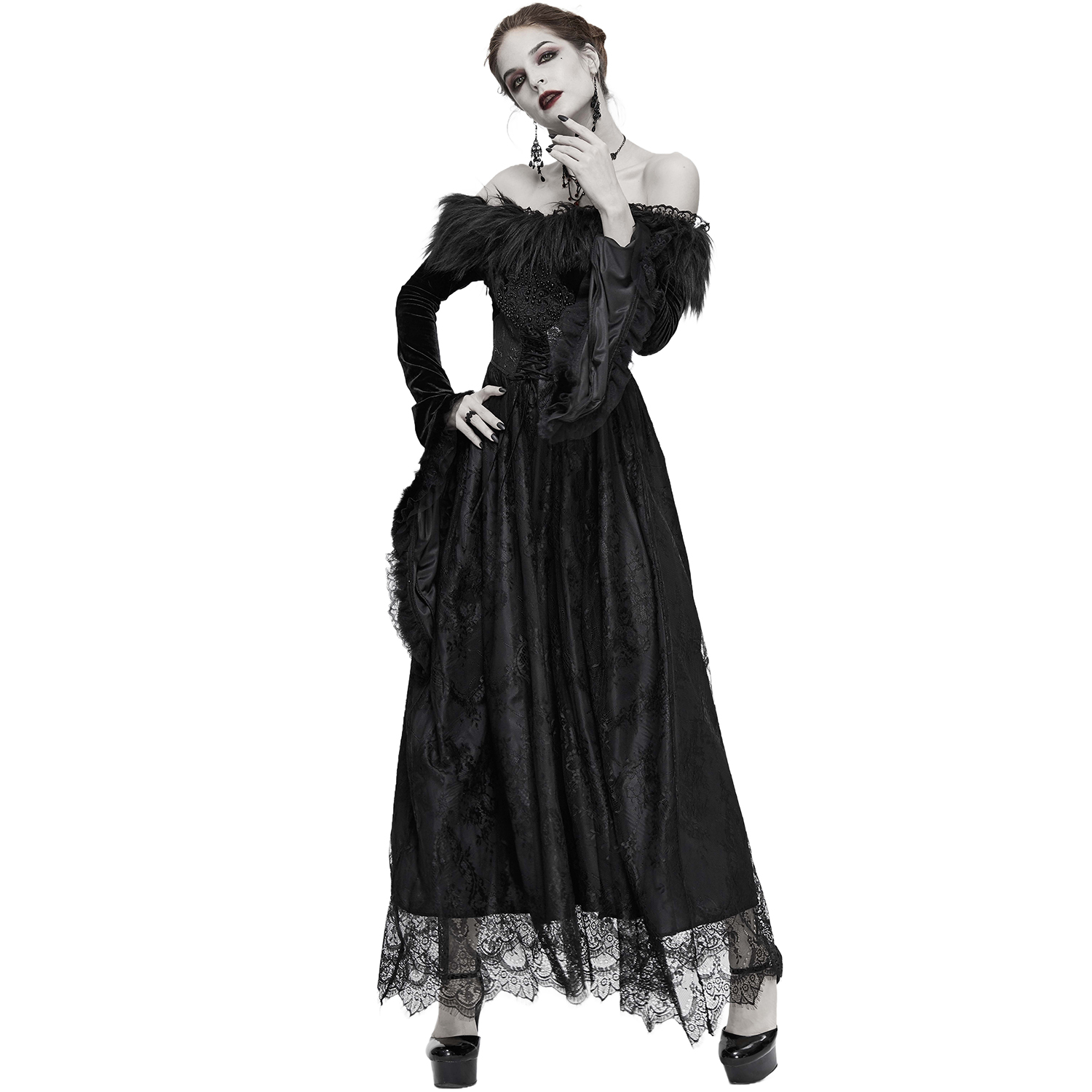 Superbe robe gothique en dentelle • Jupe longue et fluide en dentelle • Détails en résille noire transparente • Se ferme par deux boutons ornés dans la nuque et une fermeture à glissière latérale...