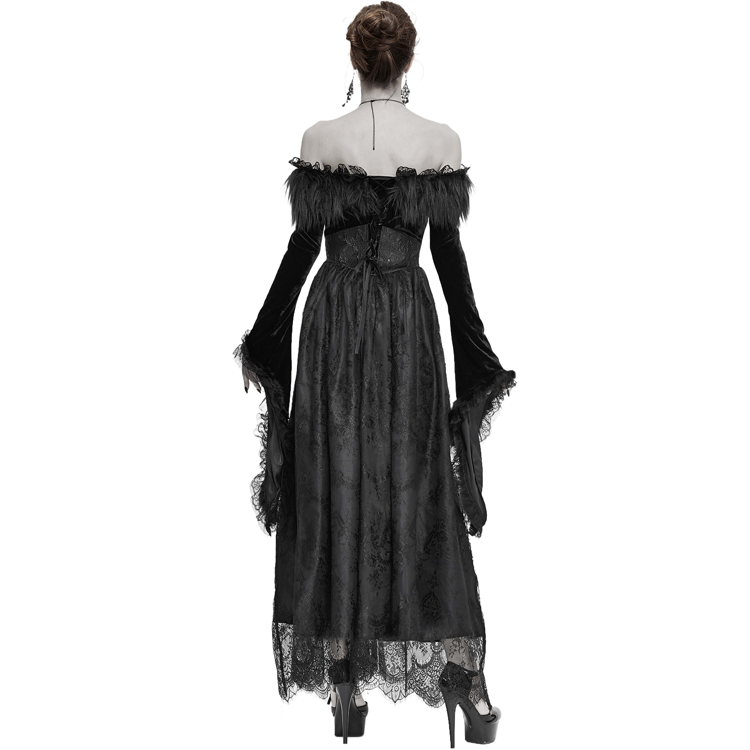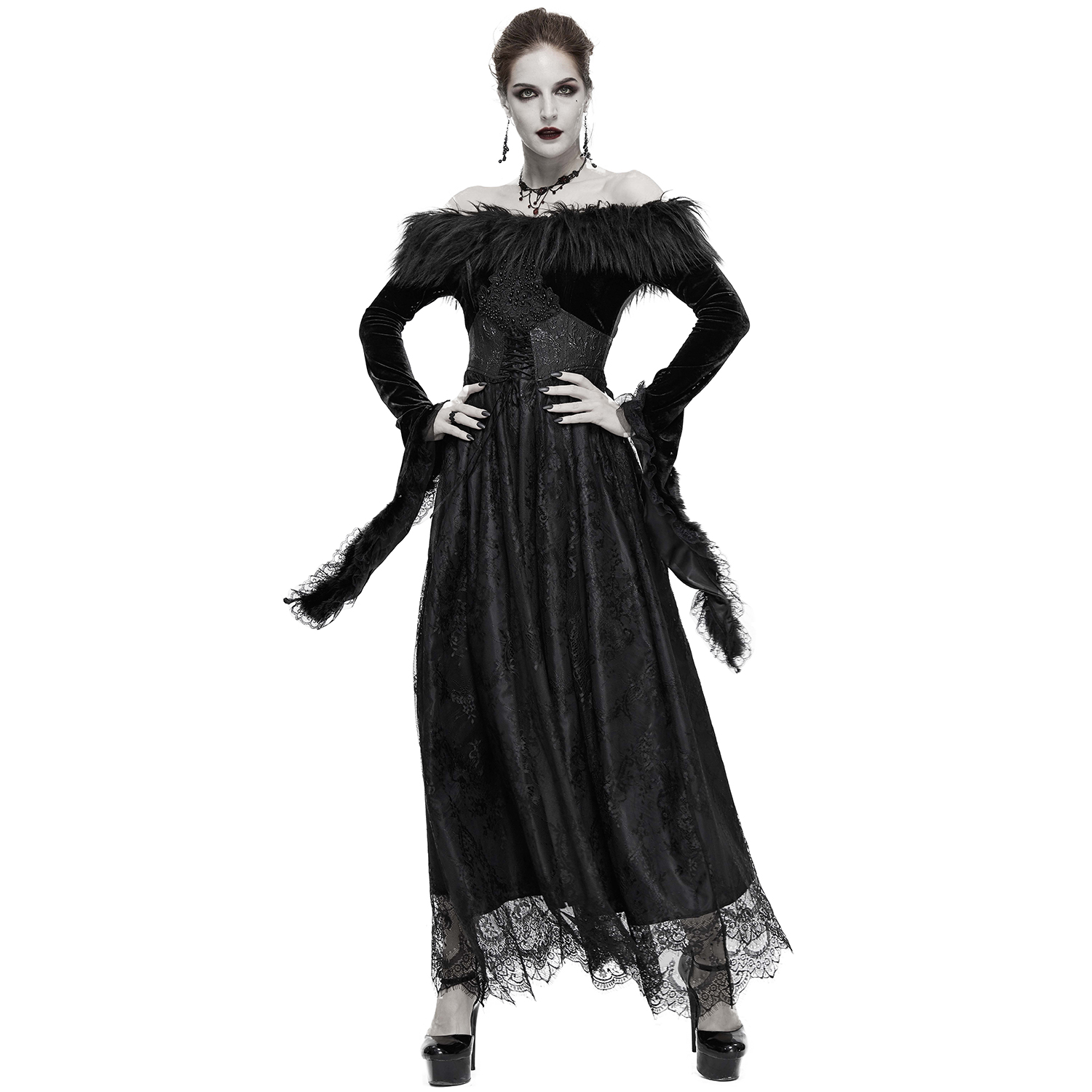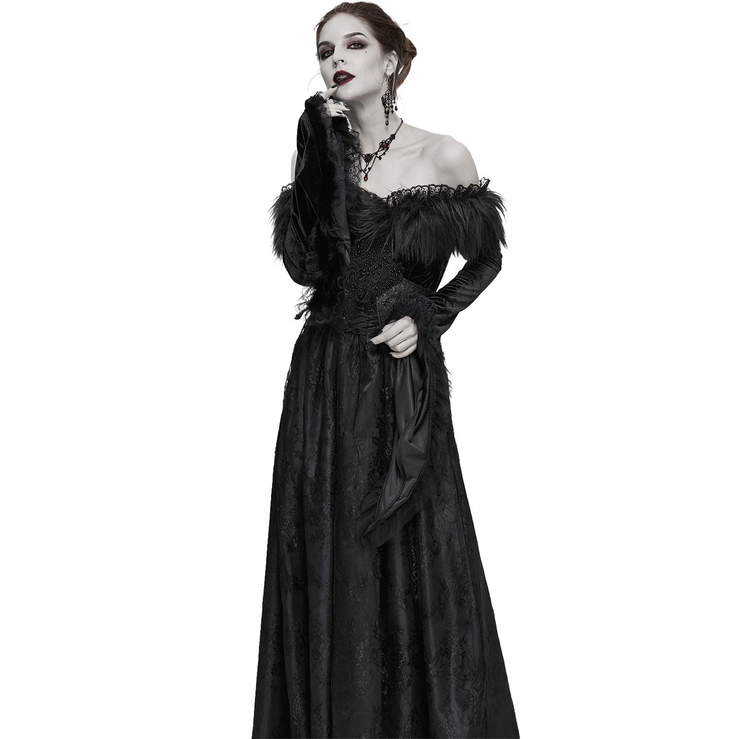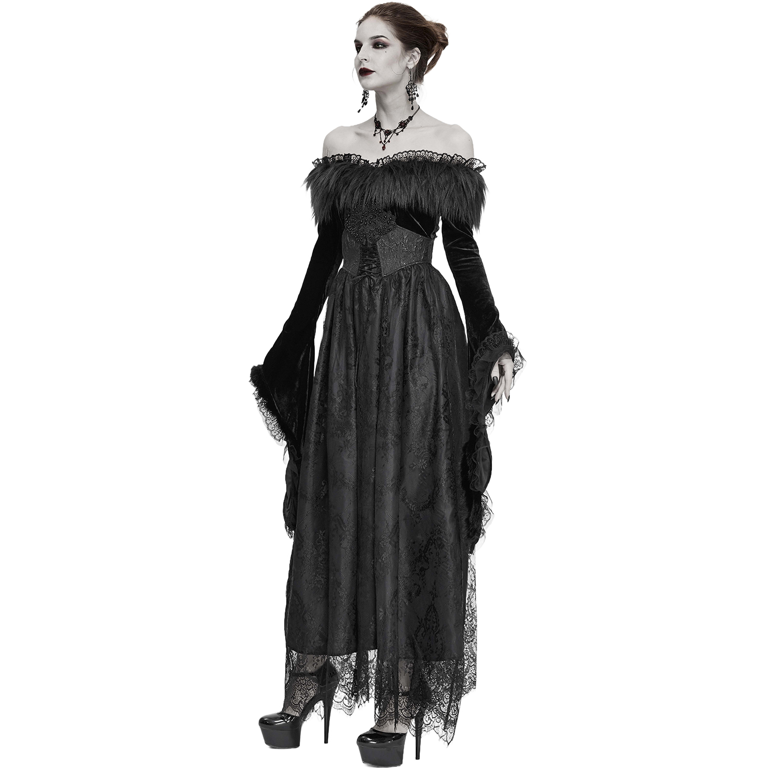 Superbe robe gothique en dentelle • Jupe longue et fluide en dentelle • Détails en résille noire transparente • Se ferme par deux boutons ornés dans la nuque et une fermeture à glissière latérale...