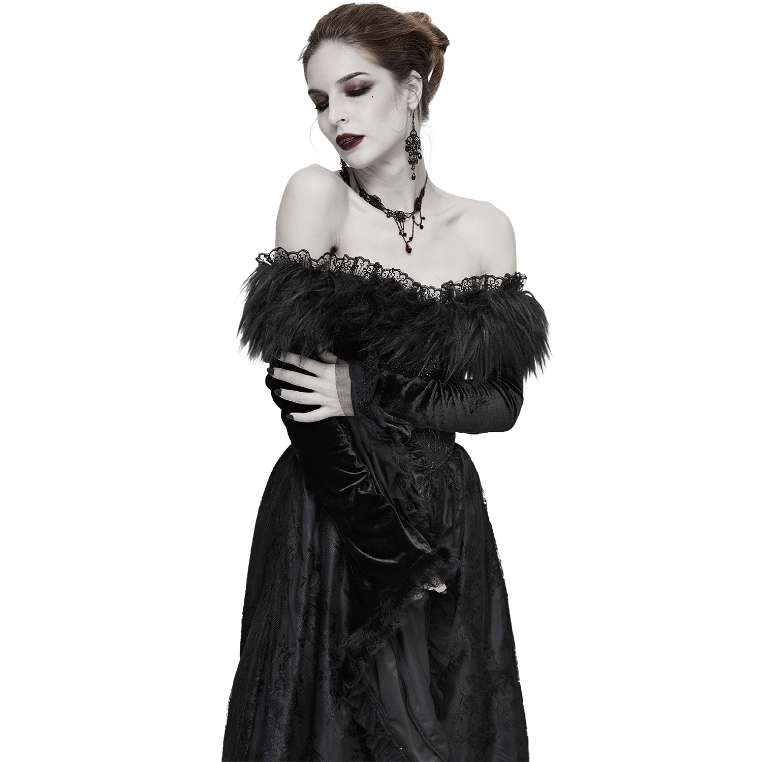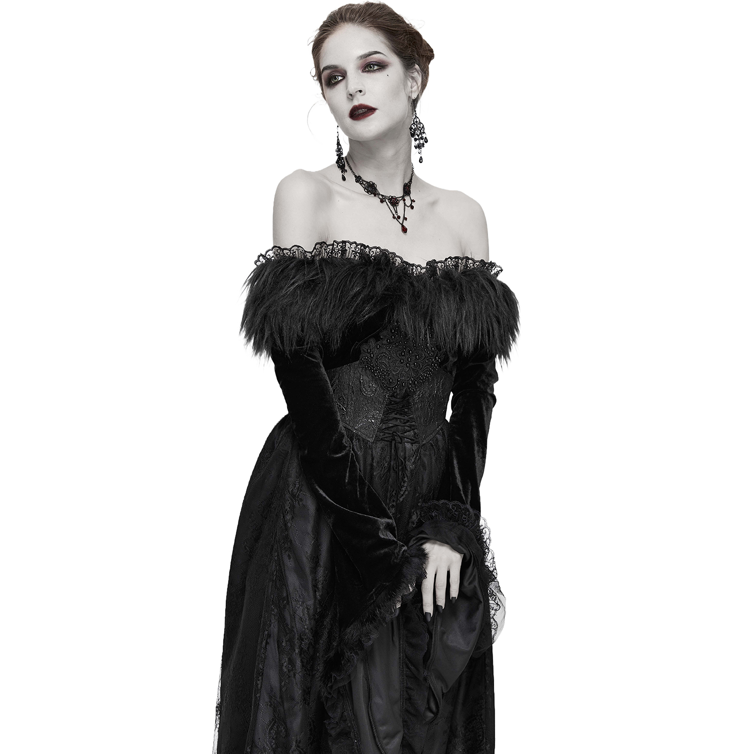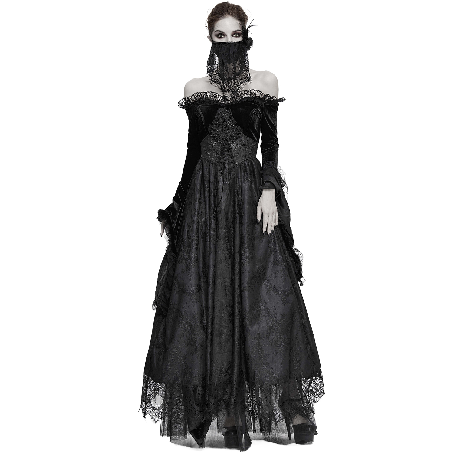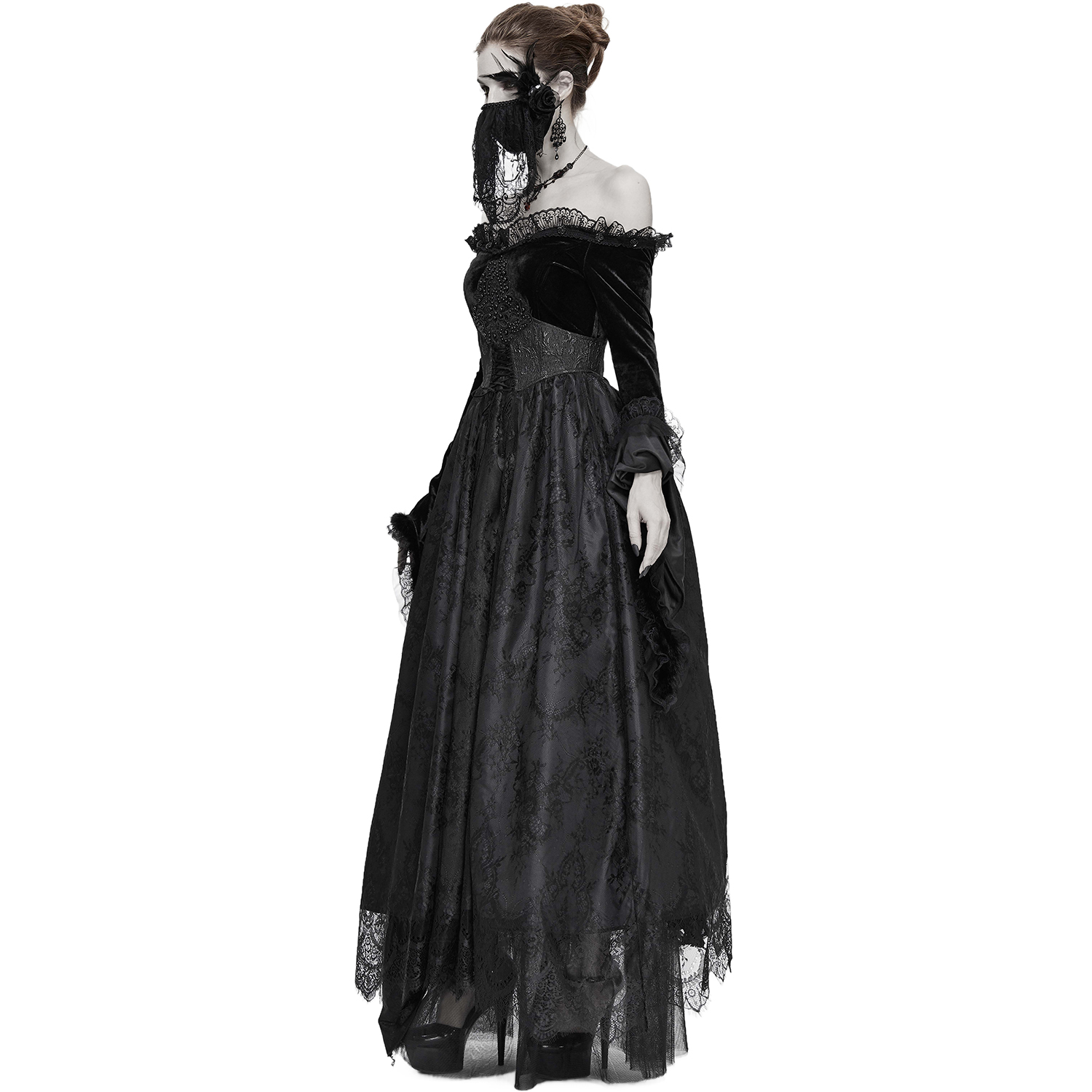Robe noire à manches longues et épaules dénudées de style gothique victorien avec manches en mousseline de soie, poitrine brodée et dos lacé. • En polyester satiné noir à motif floral •...