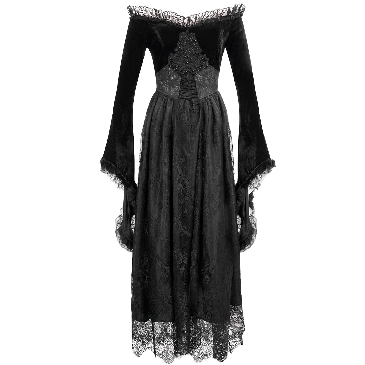 • En tissu noir vieilli et dentelles • Ourlet épissé avec une variété de tissus et distribué de manière décalée • Dentelle avec motif toile d'araignée • Œillets de séparation avec laçage...