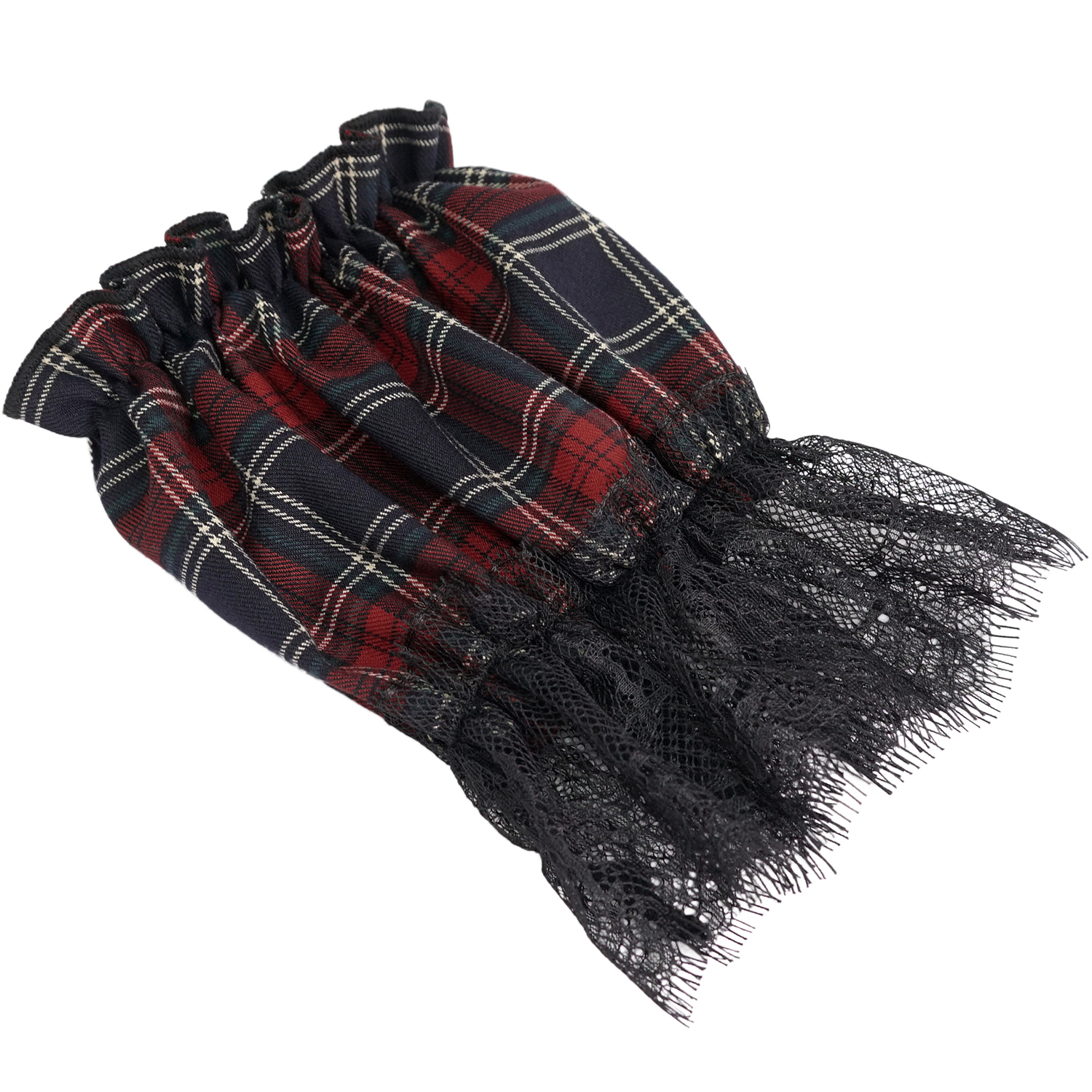 • En velours noir dense • Jupe séparée par un filet de velours et de laine • Doublure bordeaux • Bordures en dentelle • Poitrine contrastée avec de la dentelle bordeaux • Bretelles réglables...