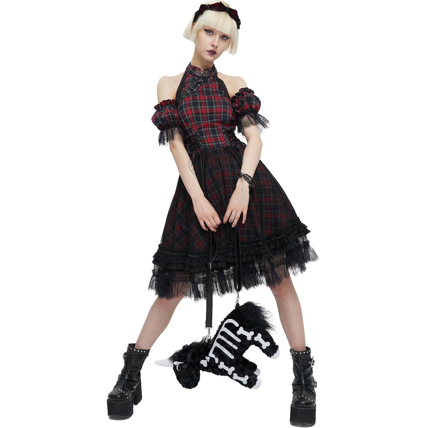 • En tissu tartan rouge et noir • Col montant avec bouton-pression dans la nuque • Broche métallique au col • Laçages sur le haut du torse et sur les deux côtés de la taille • Broderies de...