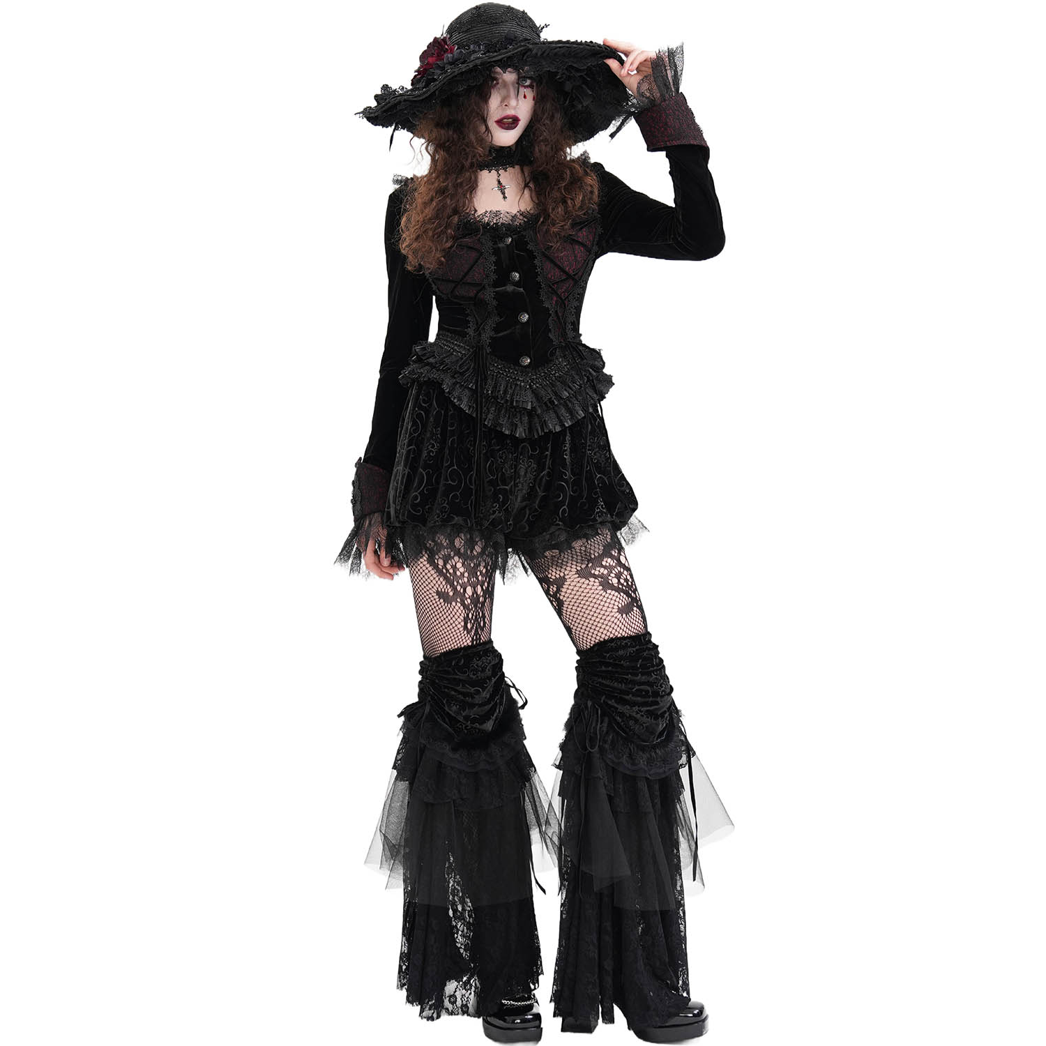 • En velours noir de haute qualité • Longue queue de pie en dentelle • Galons sur les côtés, sur le devant • Dentelle sur le haut des cuisses • Deux poches • Laçages sur de devant et à l'arrière...