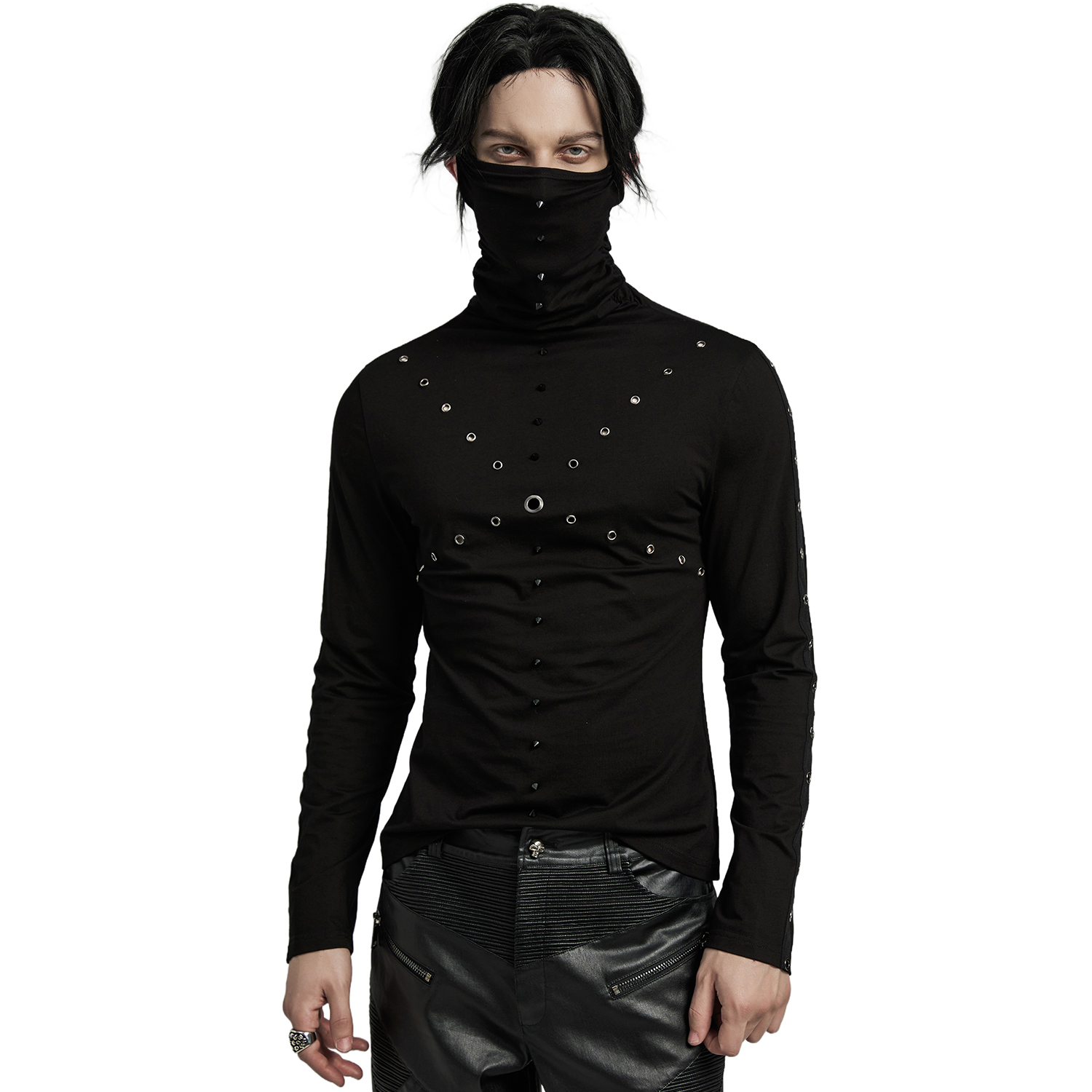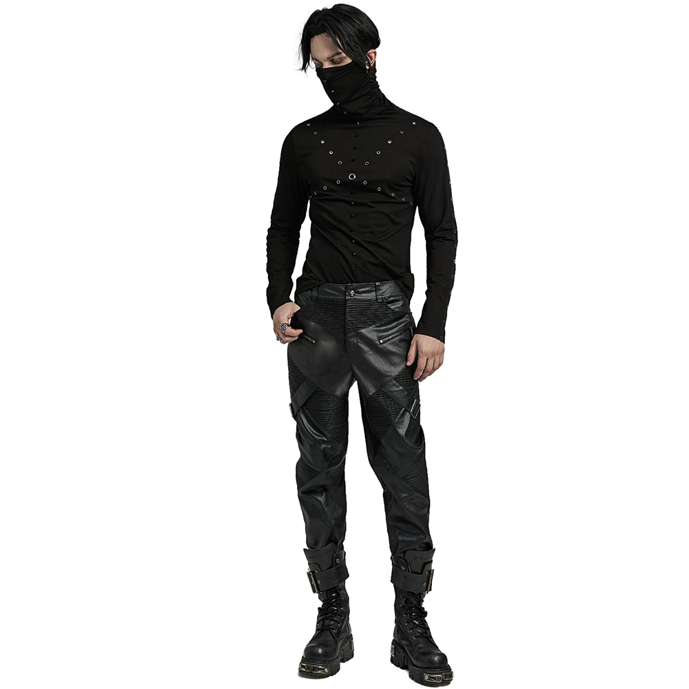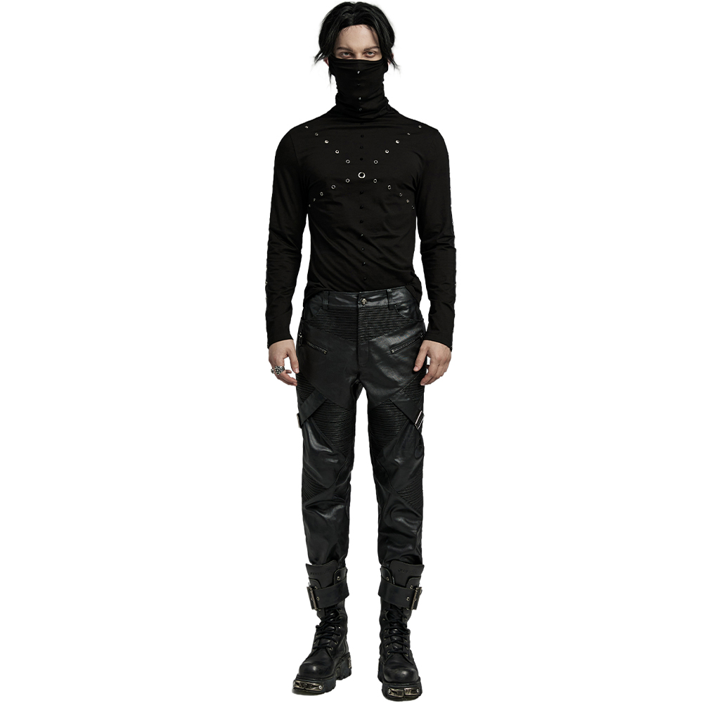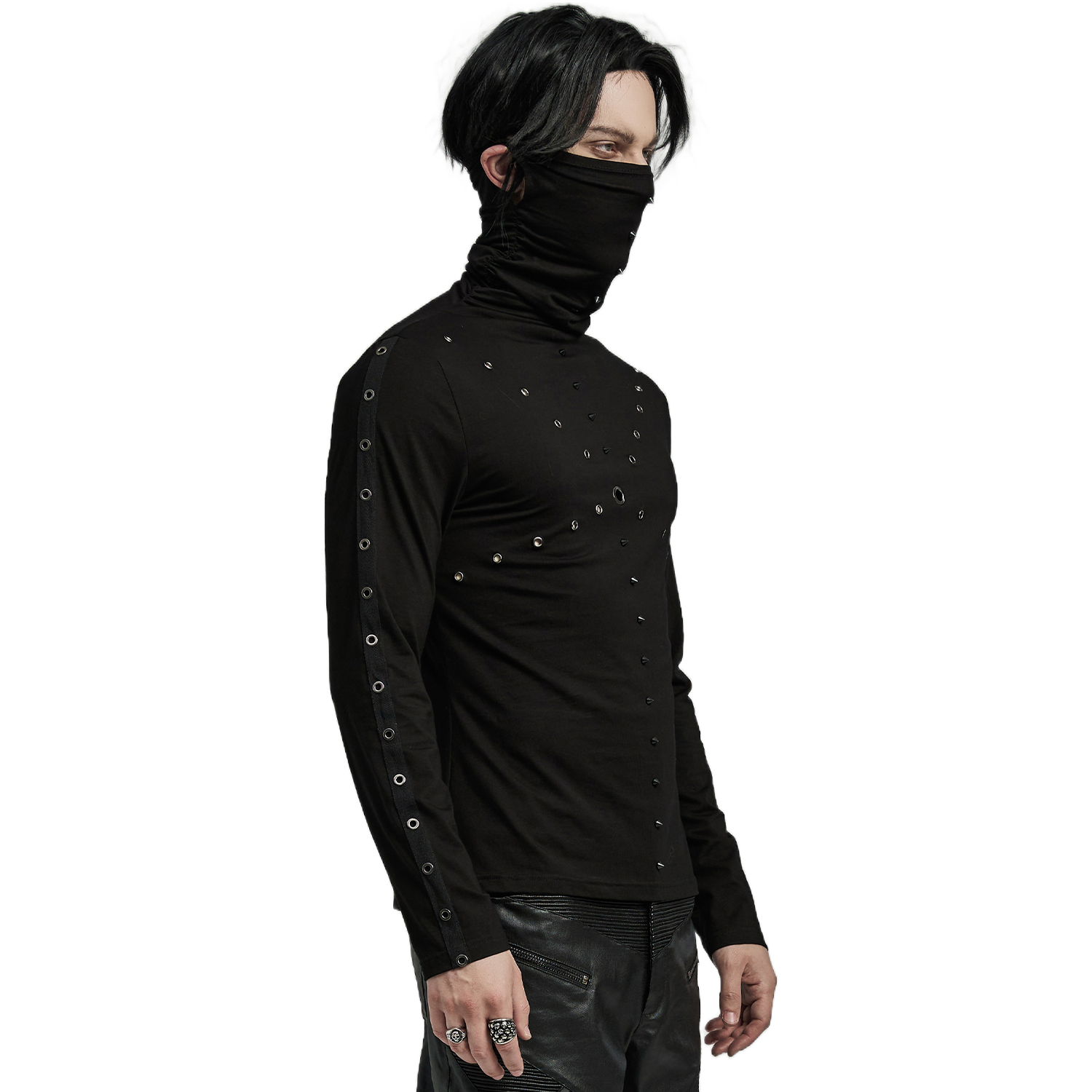 T-shirt Gothic Industrial noir à manches longues pour hommes, avec manches déchirées et décoration à l'encolure et anneaux en D. • Doublure : 100% Polyester • 95% Coton, 5% Élasthanne By Punk...