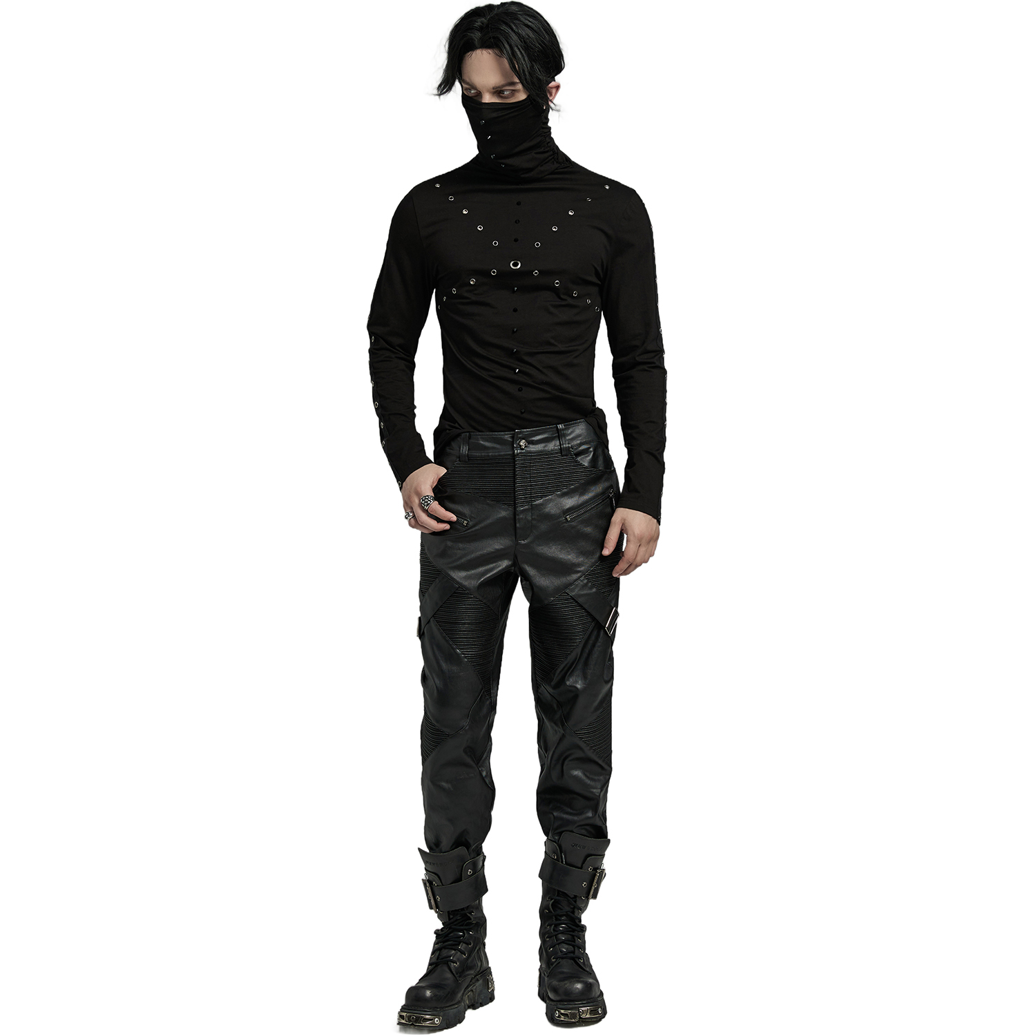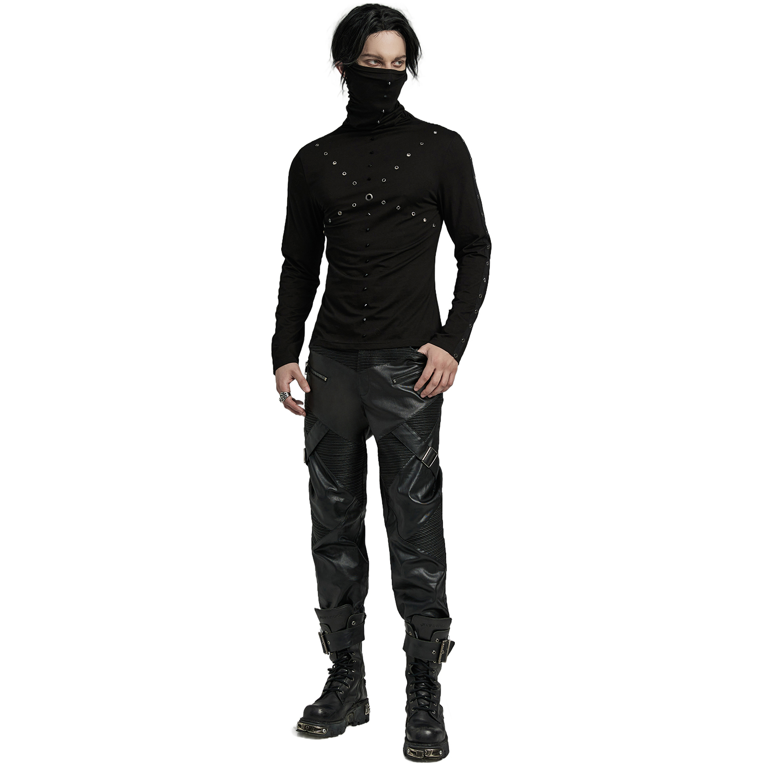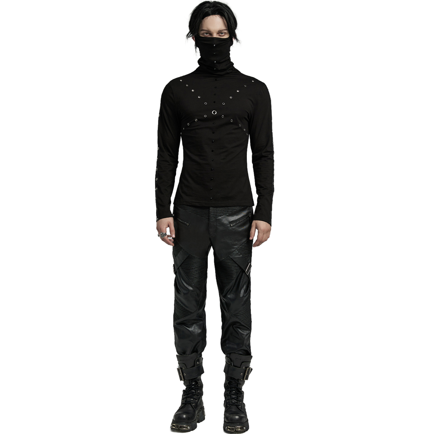 T-shirt Gothic Industrial noir à manches longues pour hommes, avec manches déchirées et décoration à l'encolure et anneaux en D. • Doublure : 100% Polyester • 95% Coton, 5% Élasthanne By Punk...
