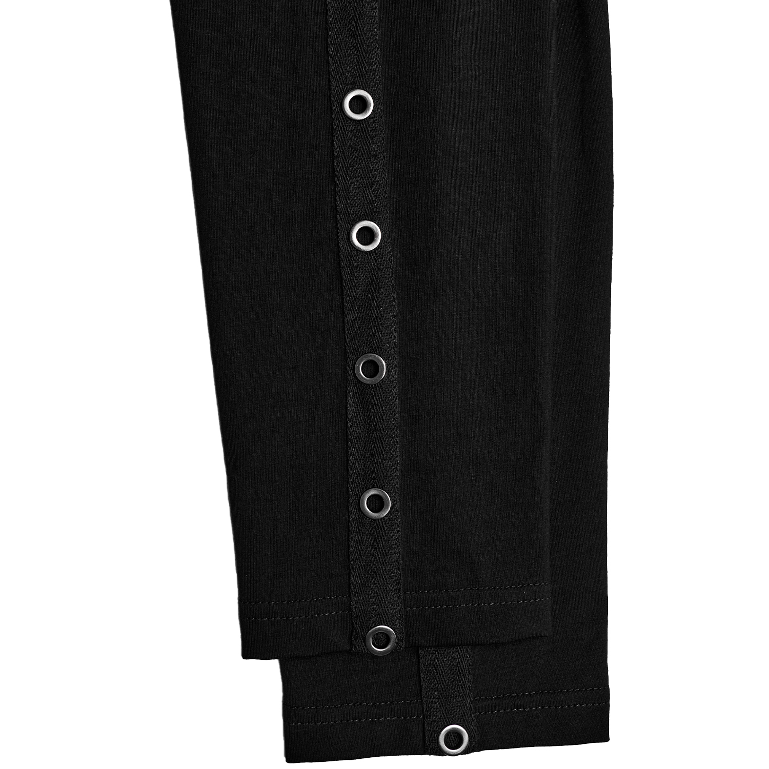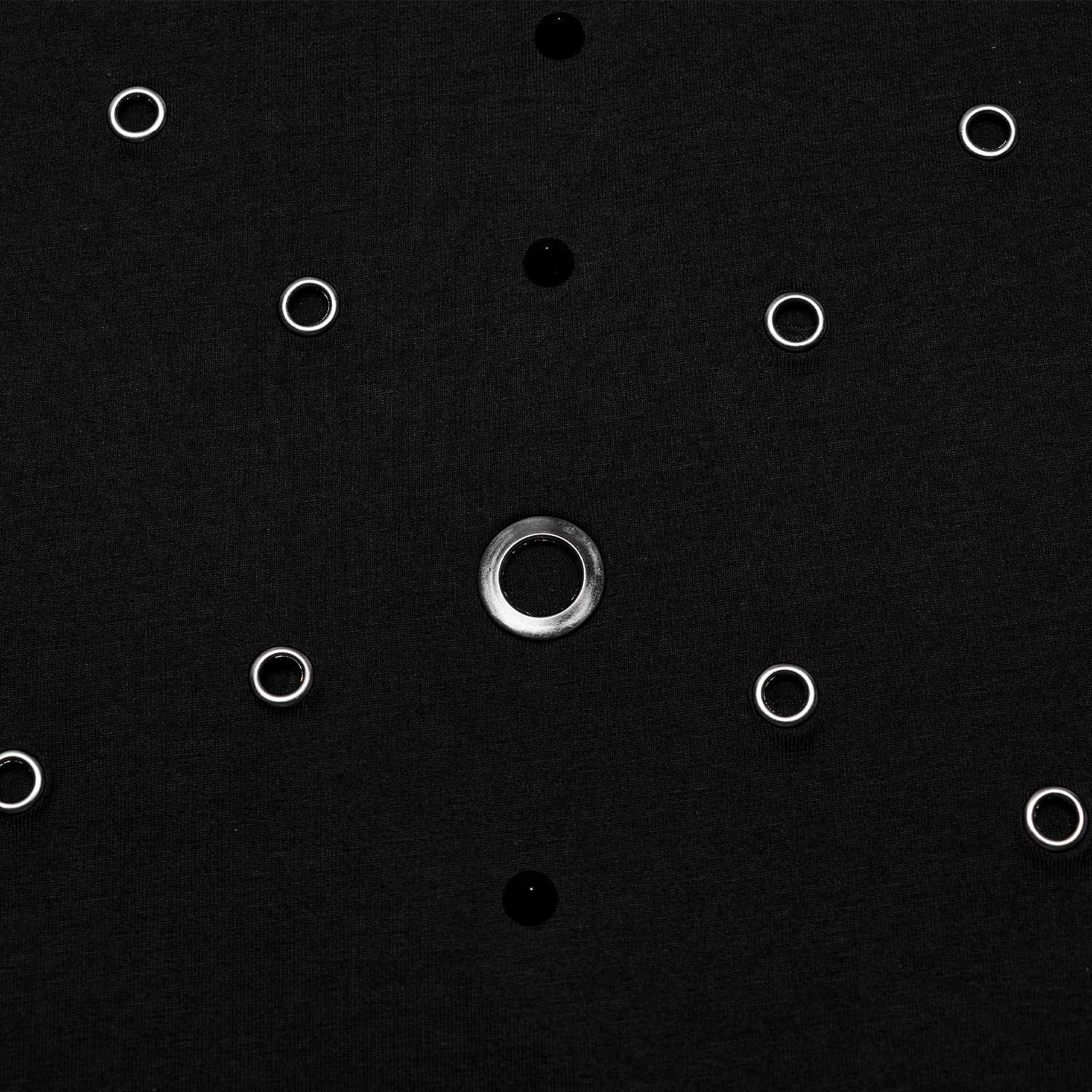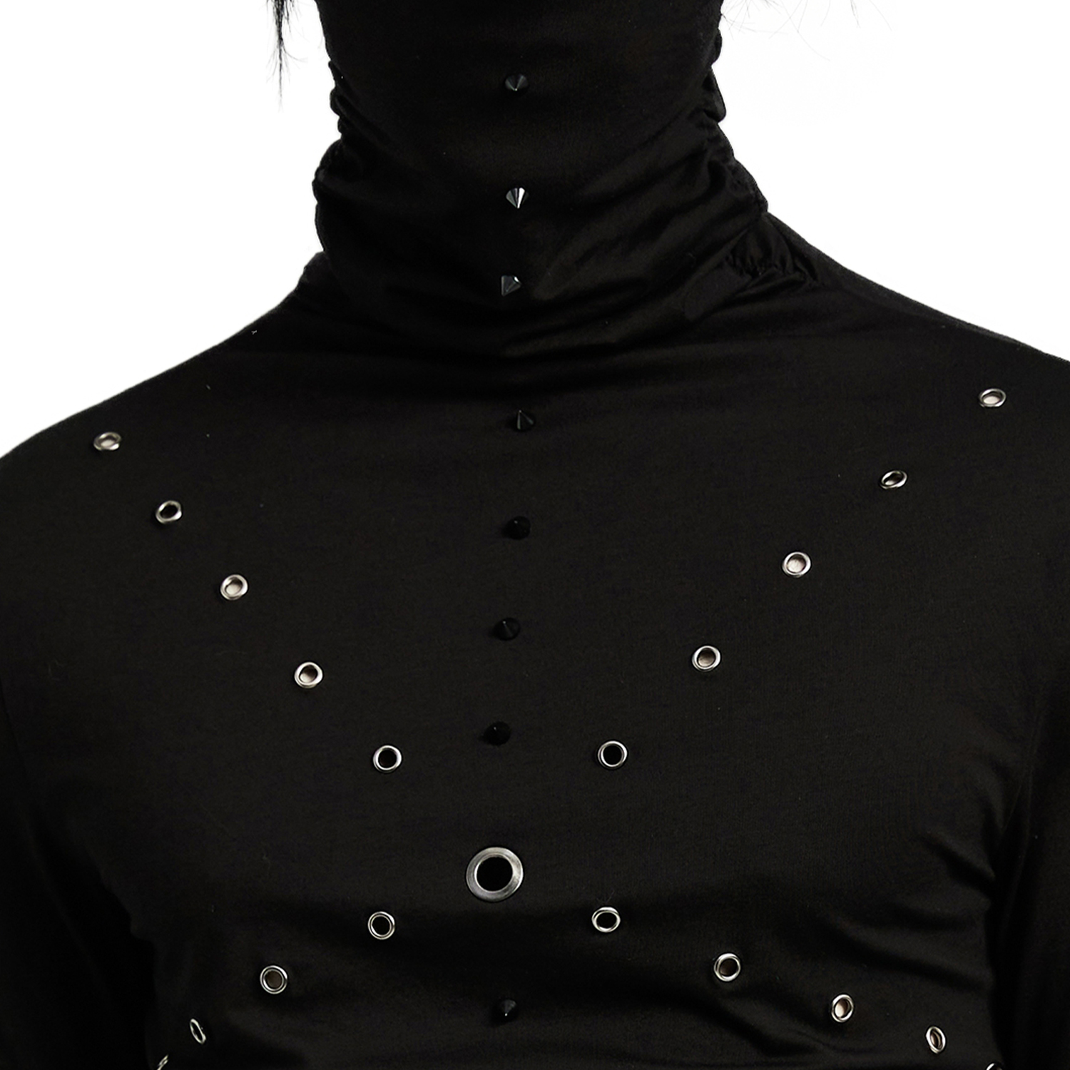 • En tissu élastique noir • Épissage symétrique des trous à l'avant • Chaînes métalliques pour plus de personnalité et d'originalité • Bandes en simili cuir avec œillets sur les deux manches •...