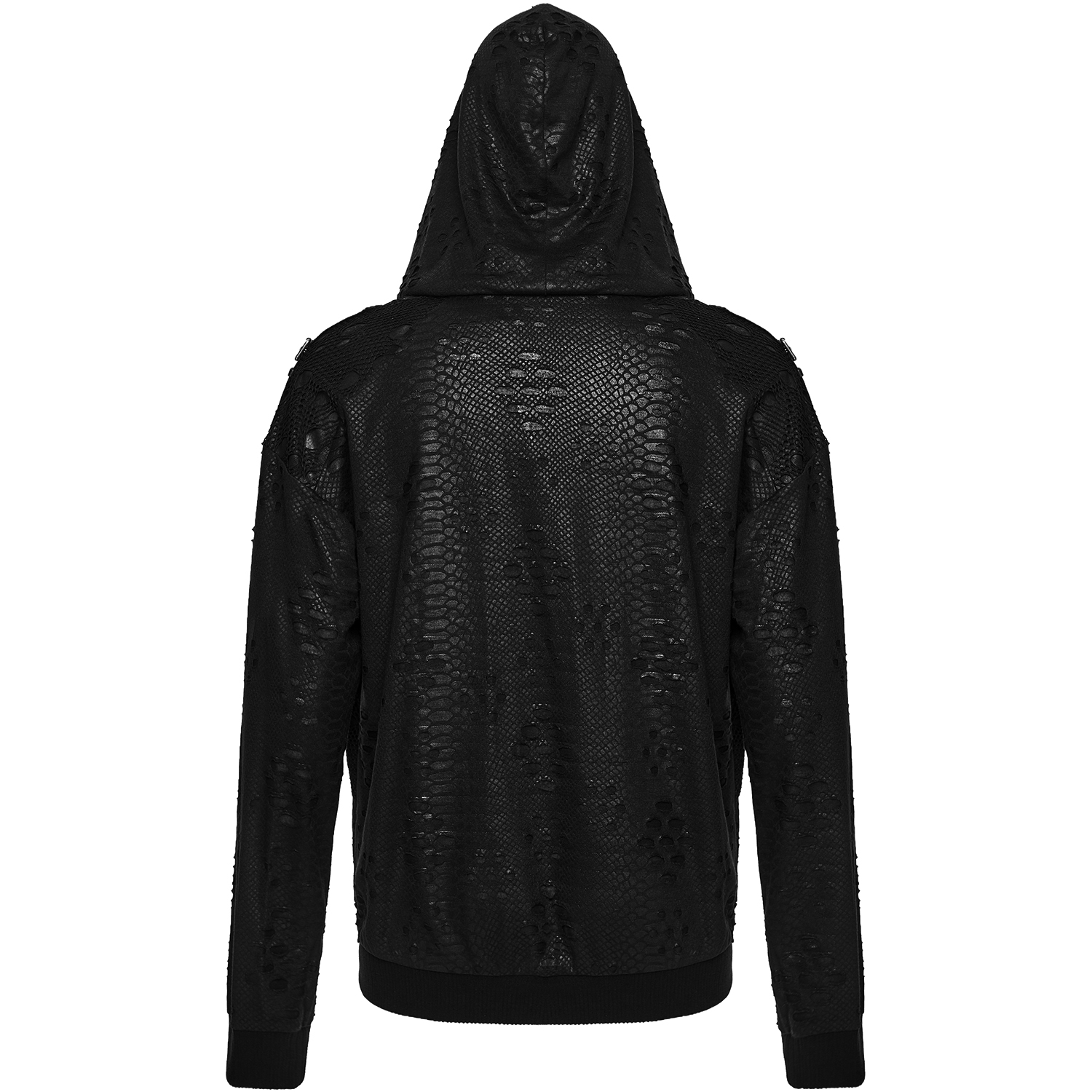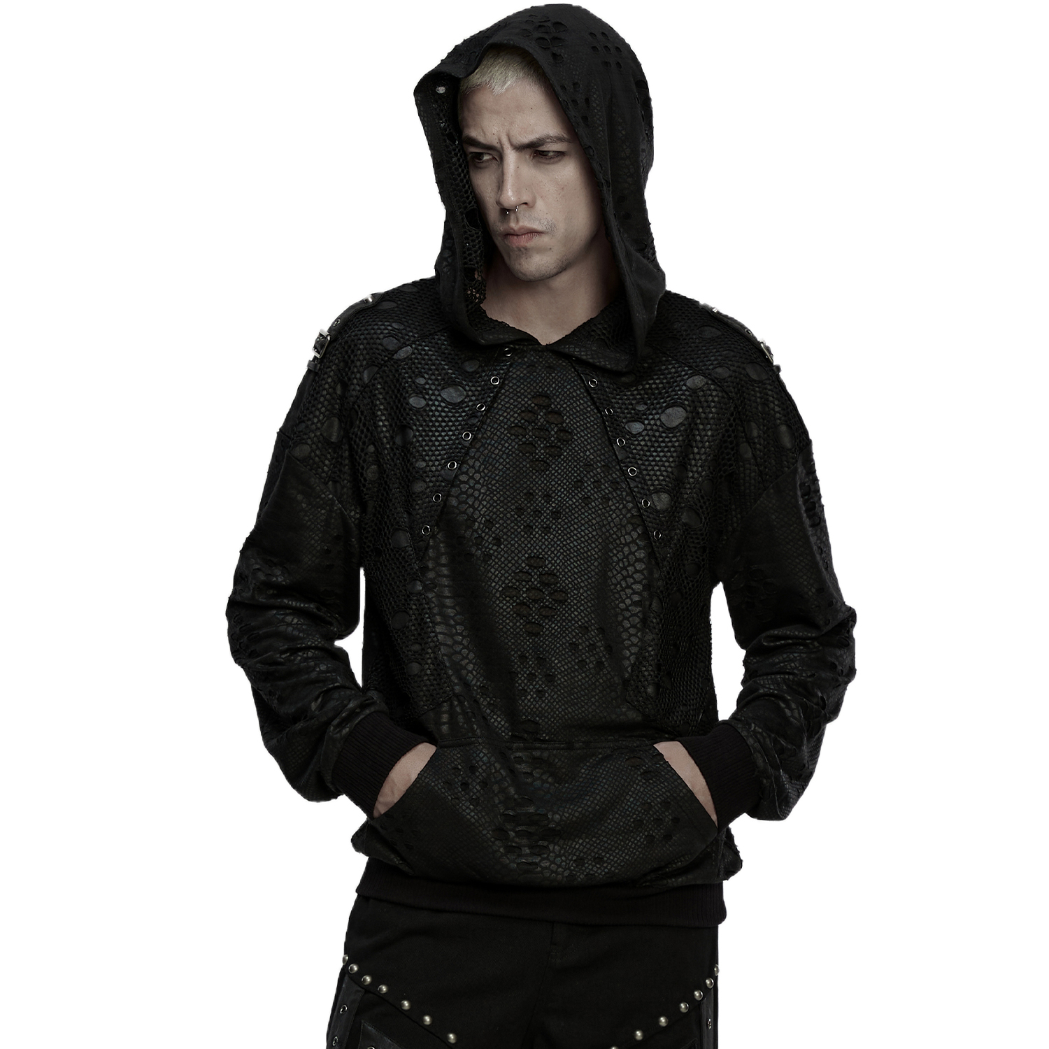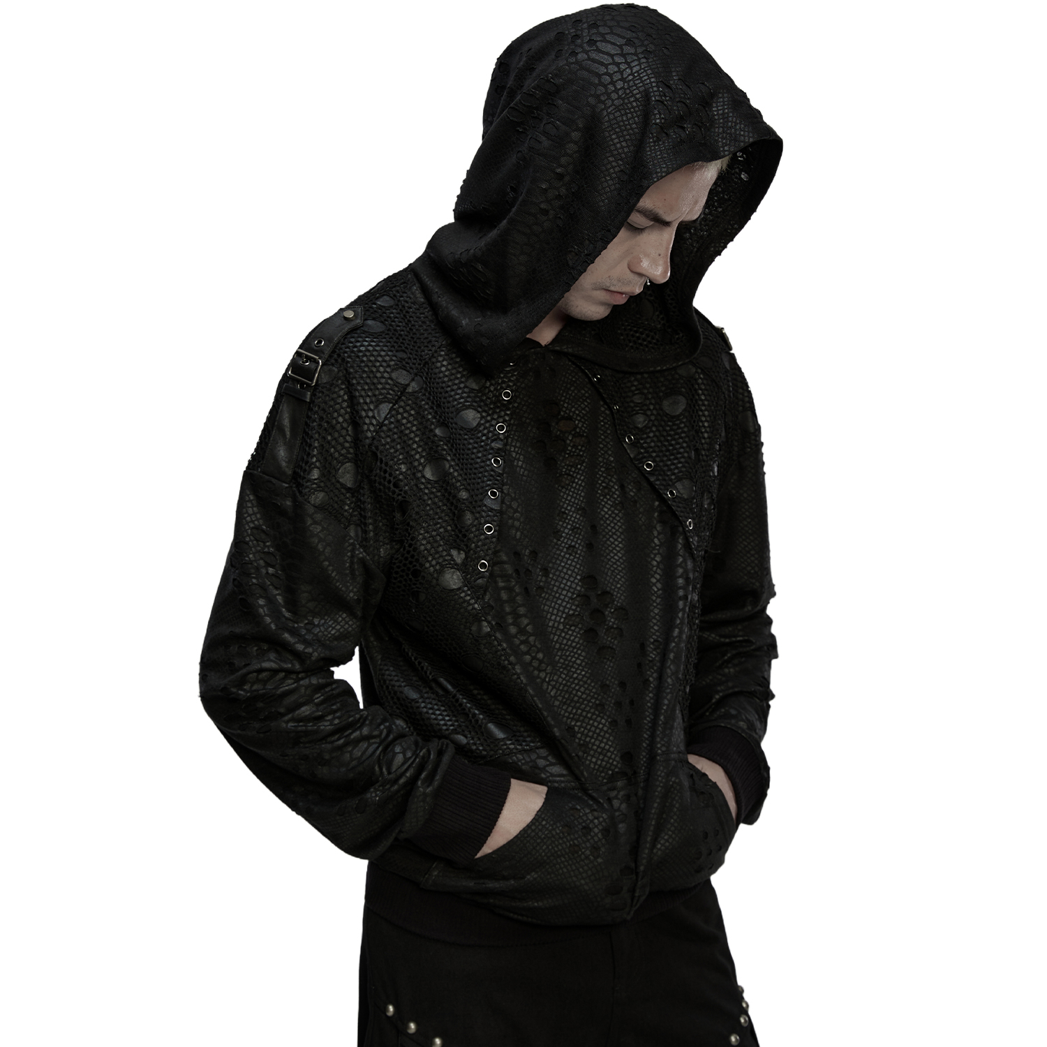 Pull de style post apocalyptique à capuche et manches longues pour hommes • En coton stretch côtelé, noir et doux • Encolure zippée avec tissus déchiqueté • Capuche surdimensionnée en différents...
