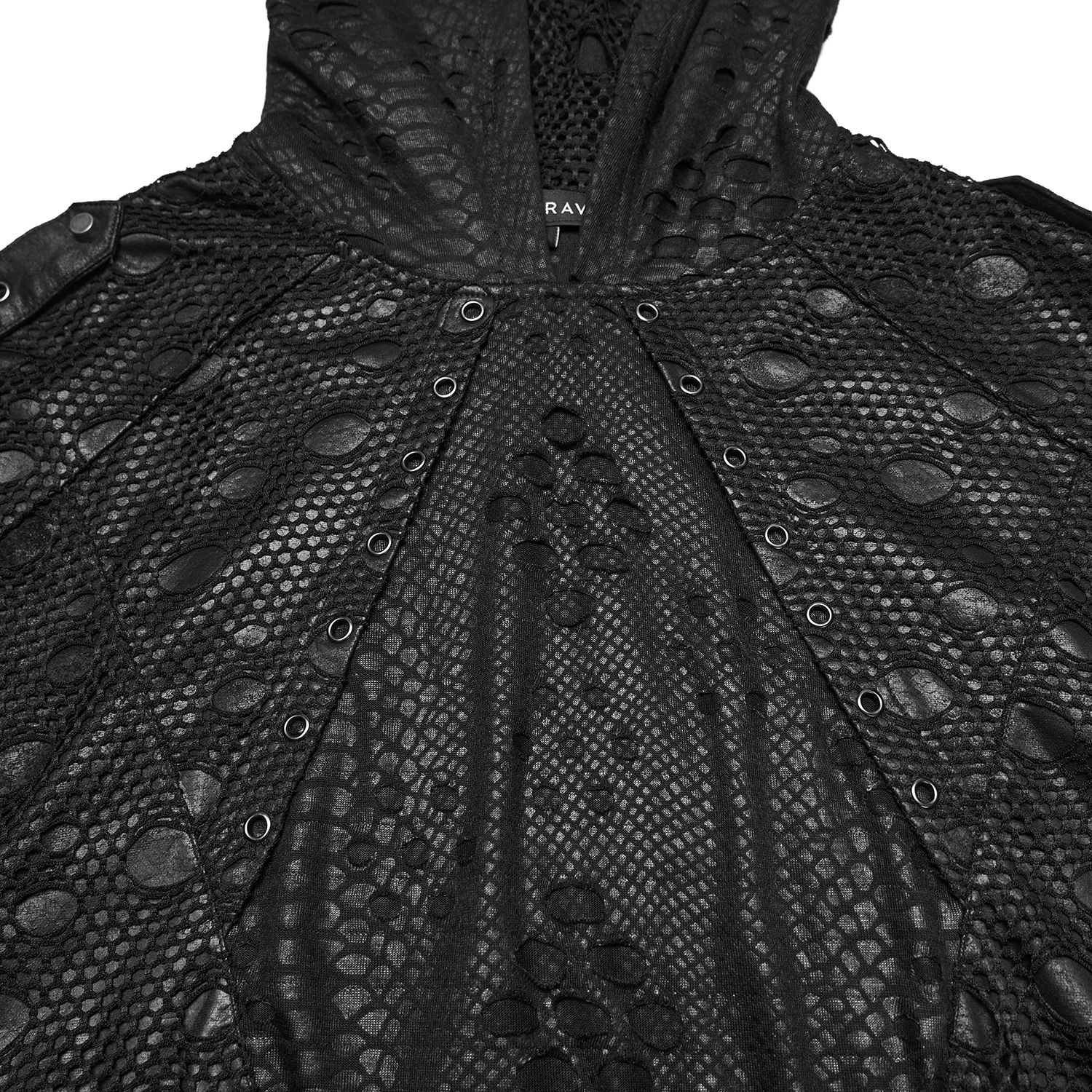 Haut à manches longues de style gothique post-apocalyptique et industriel avec capuche et épaules lacées. • Notez la couche de tissus lacéré sur le corps et la capuche • Il y a un trou dans...