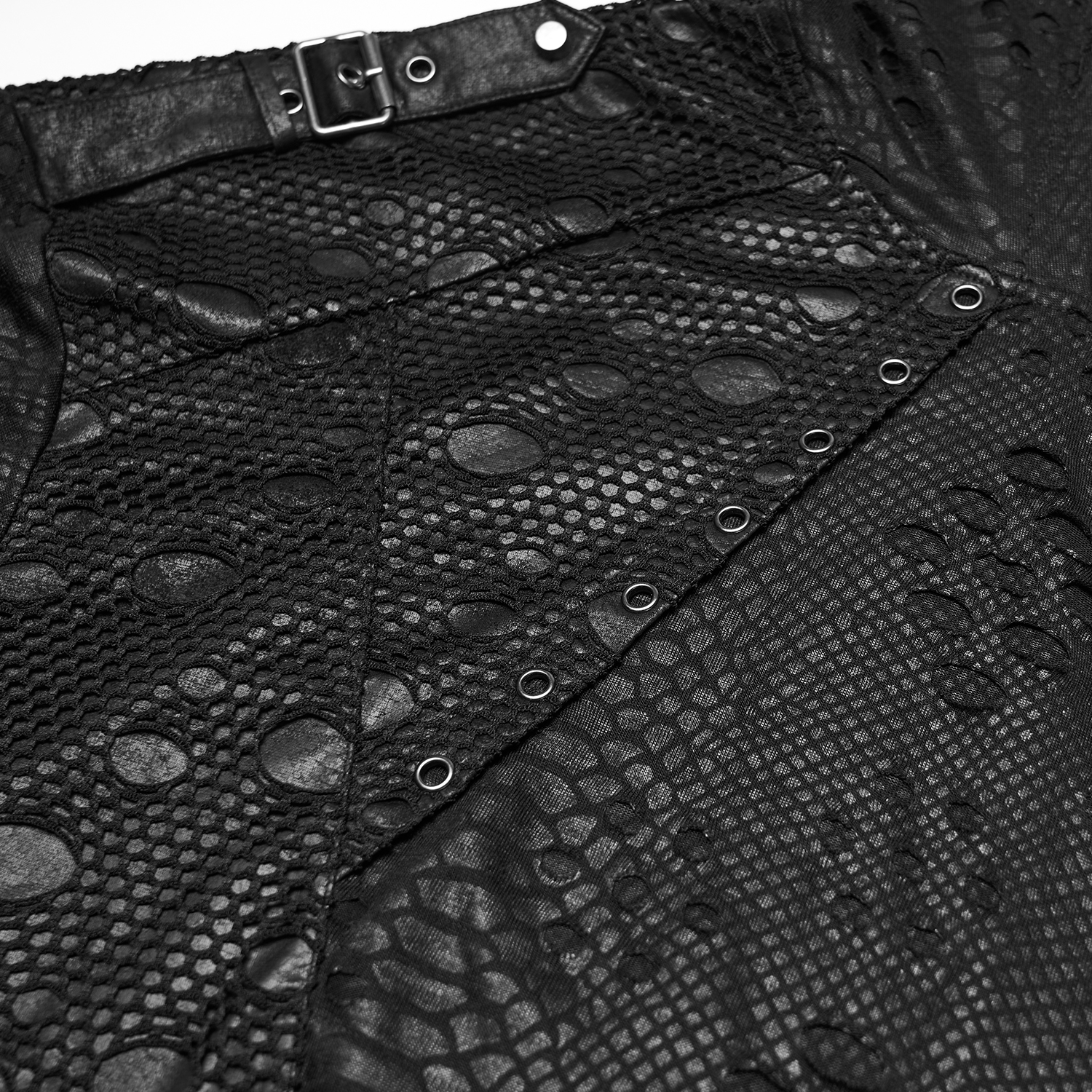 • En tissu élastique noir • Épissage symétrique des trous à l'avant • Chaînes métalliques pour plus de personnalité et d'originalité • Bandes en simili cuir avec œillets sur les deux manches •...