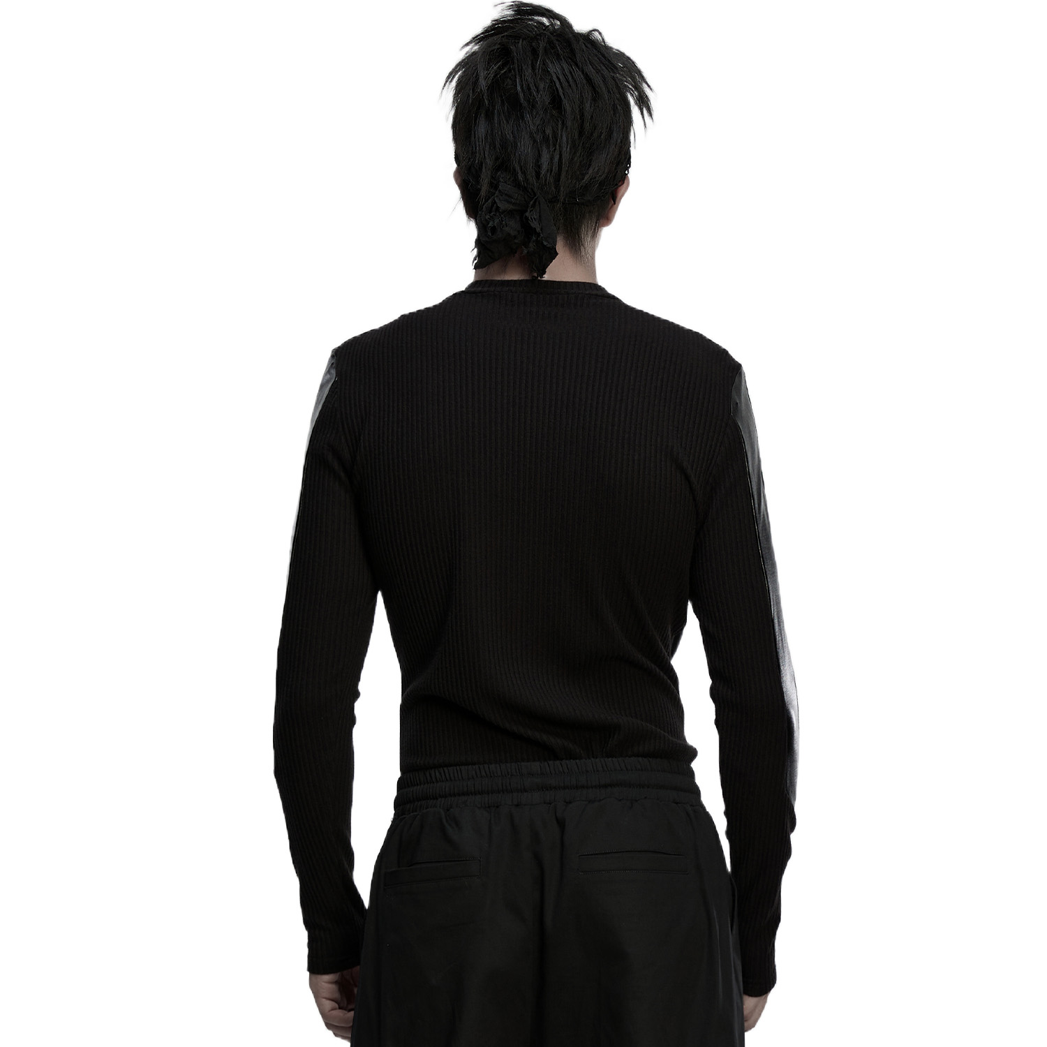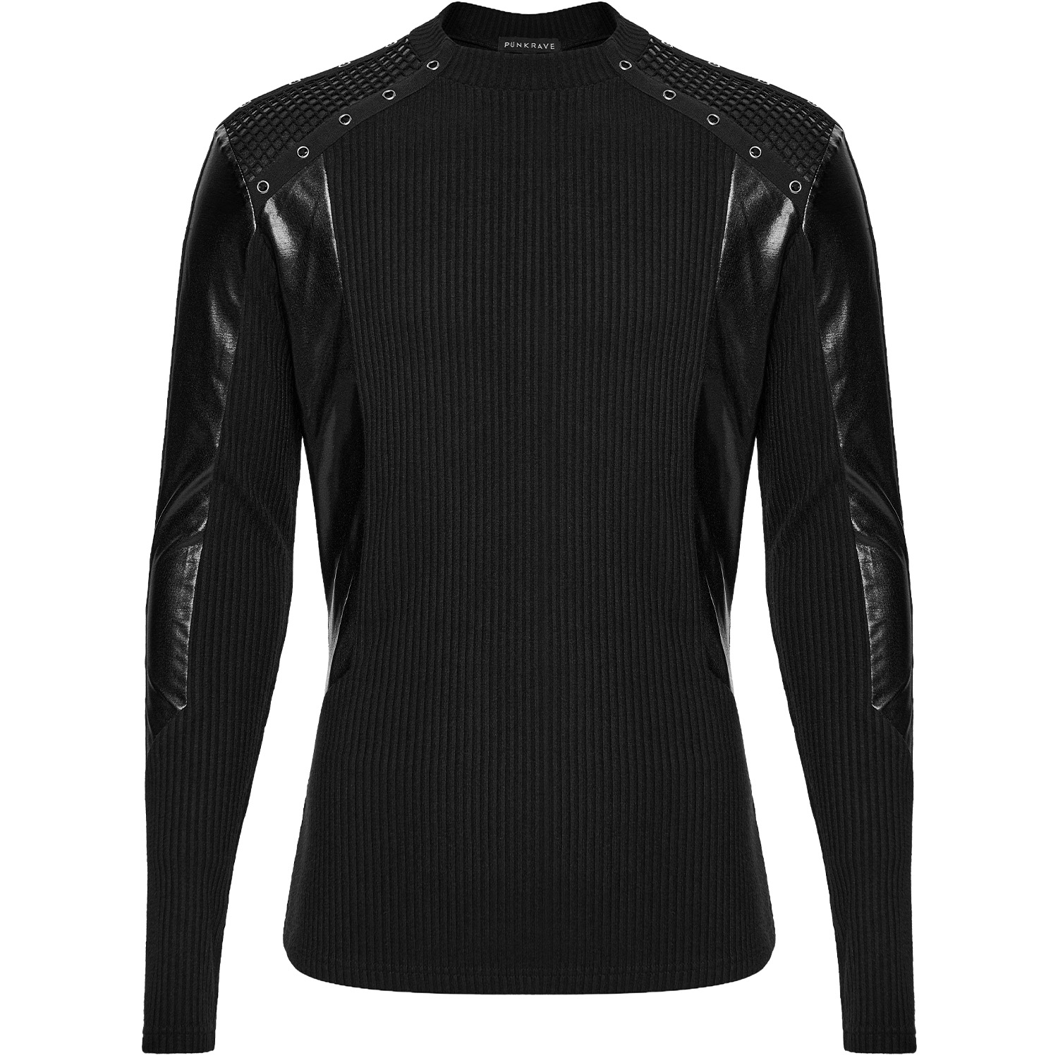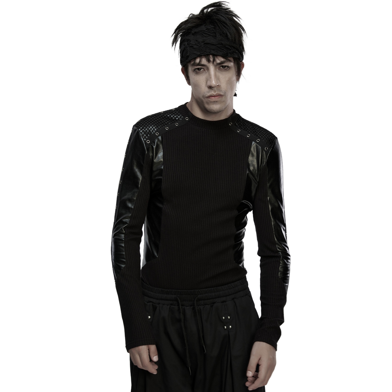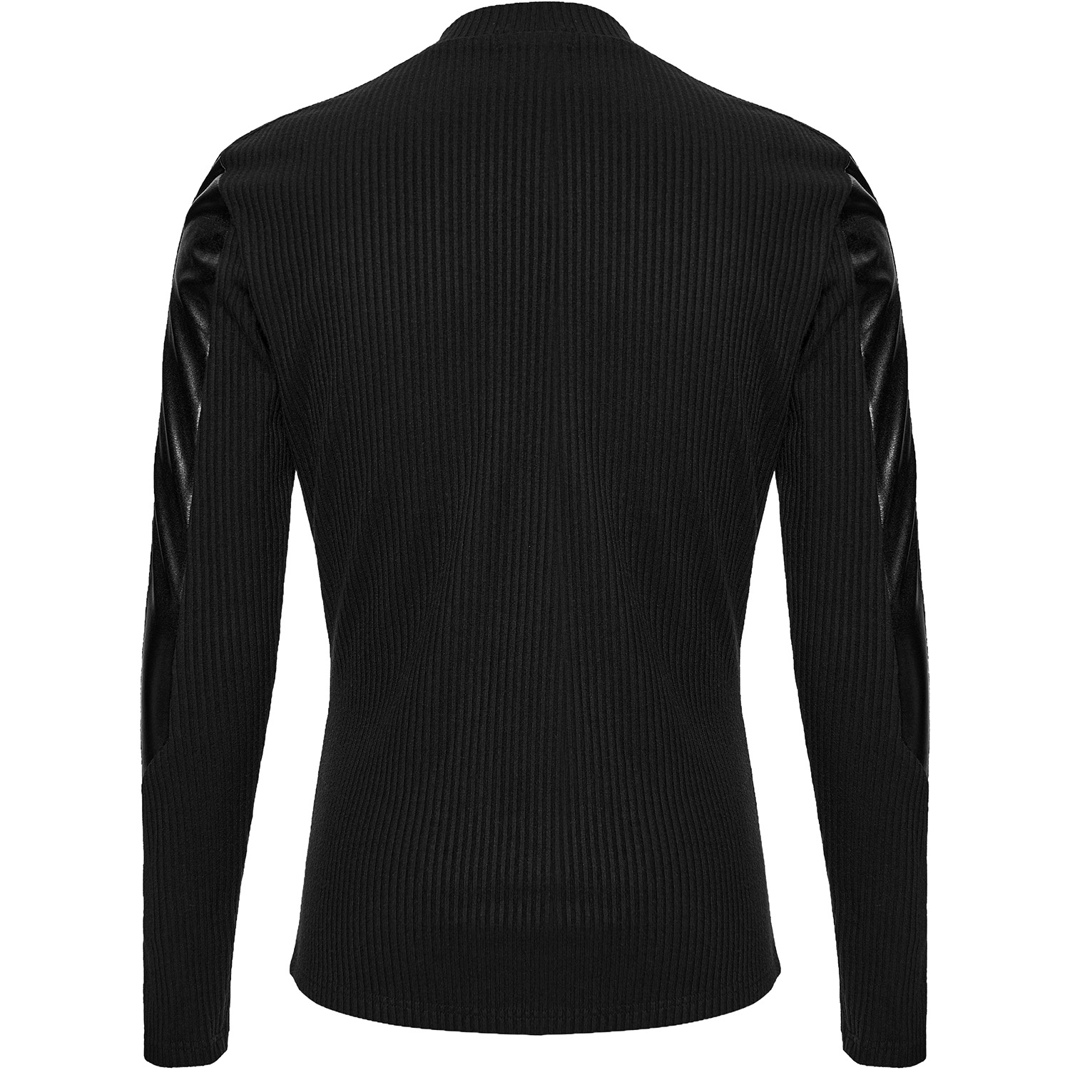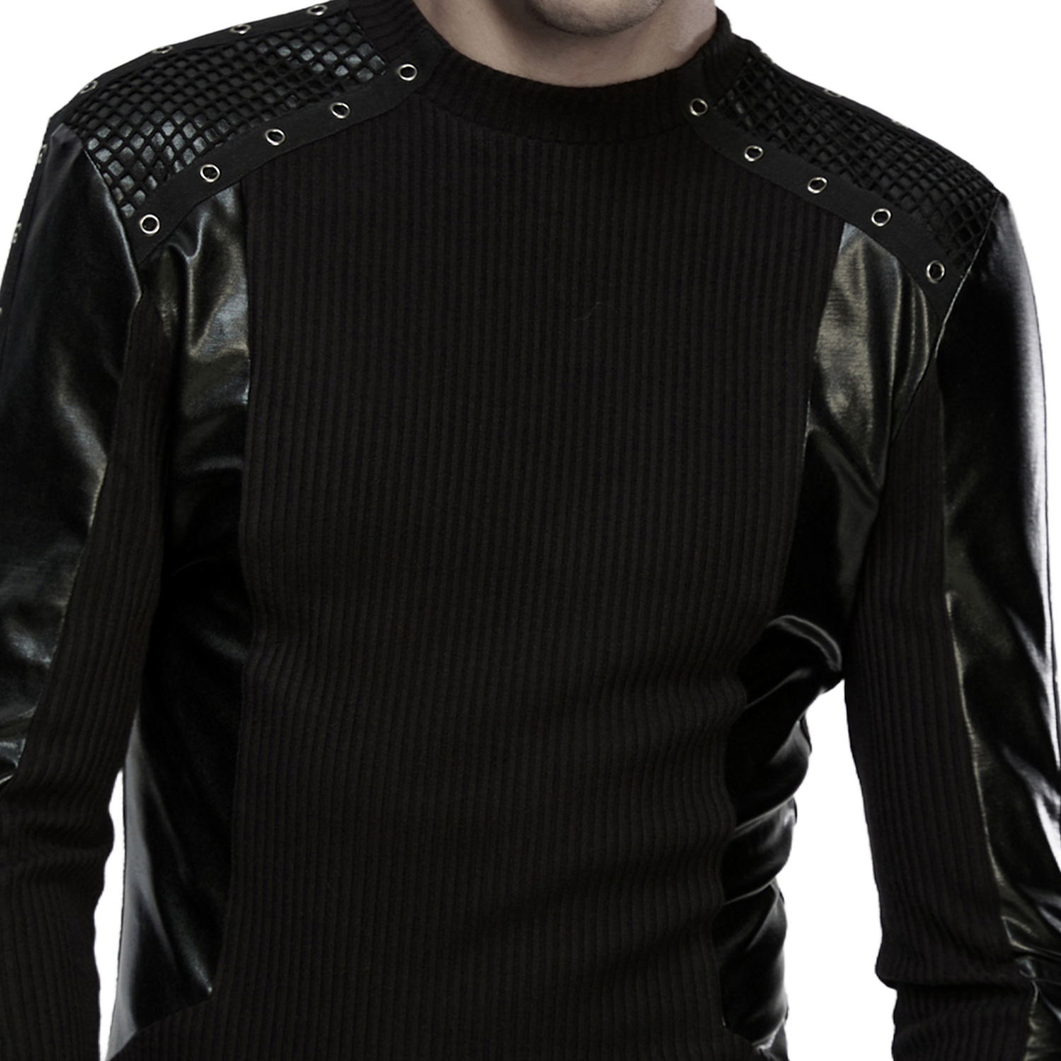 Polo à manches longues avec lacets de style steampunk • Tissu noir doux, extensible et délavé • Col ras du cou • Garnitures en cuir synthétique marron doux sur les épaules et les manches...