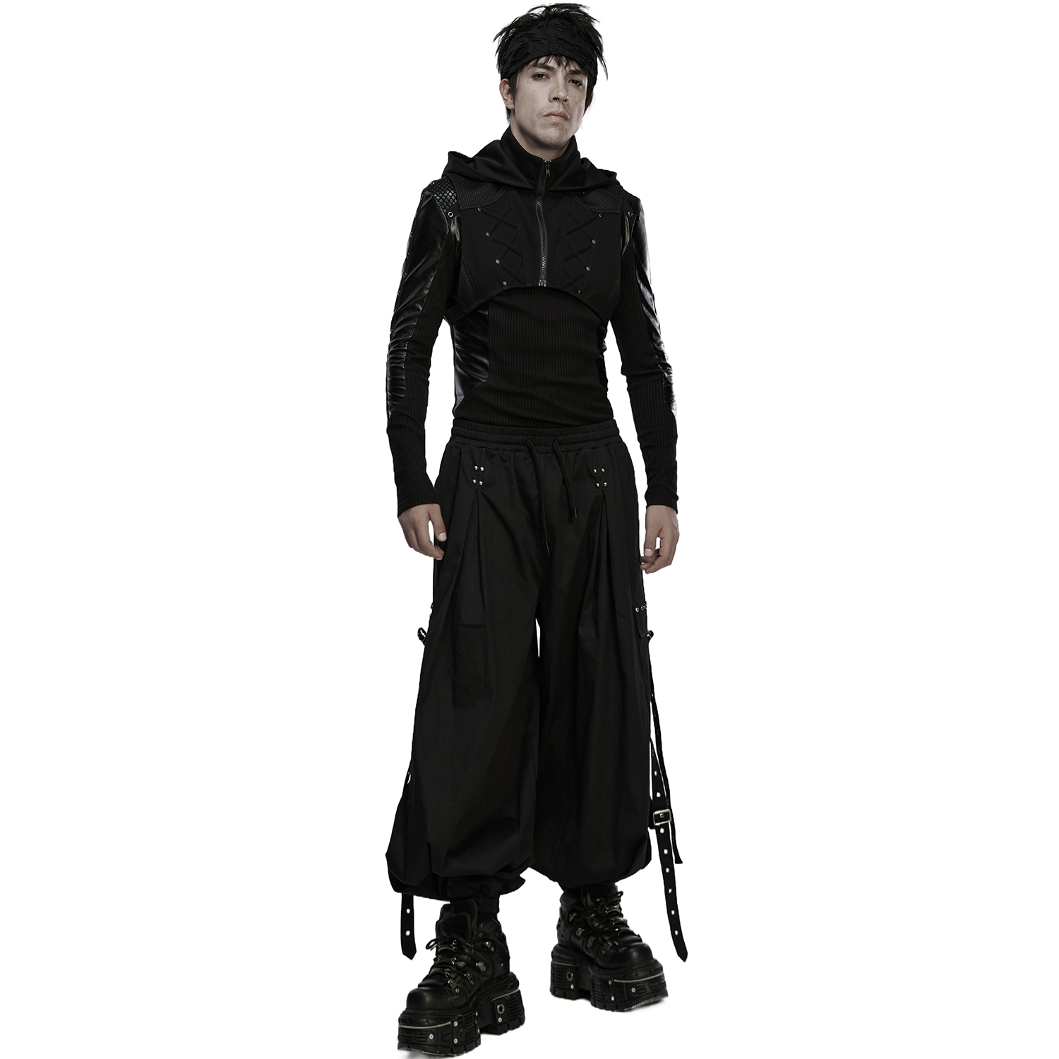Pull de style post apocalyptique à capuche et manches longues pour hommes • En coton stretch côtelé, noir et doux • Encolure zippée avec tissus déchiqueté • Capuche surdimensionnée en différents...