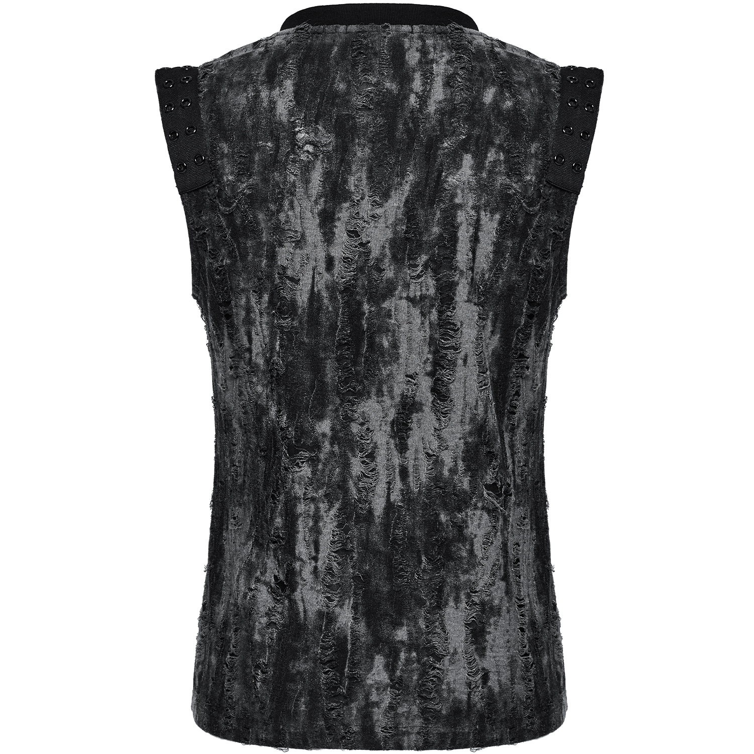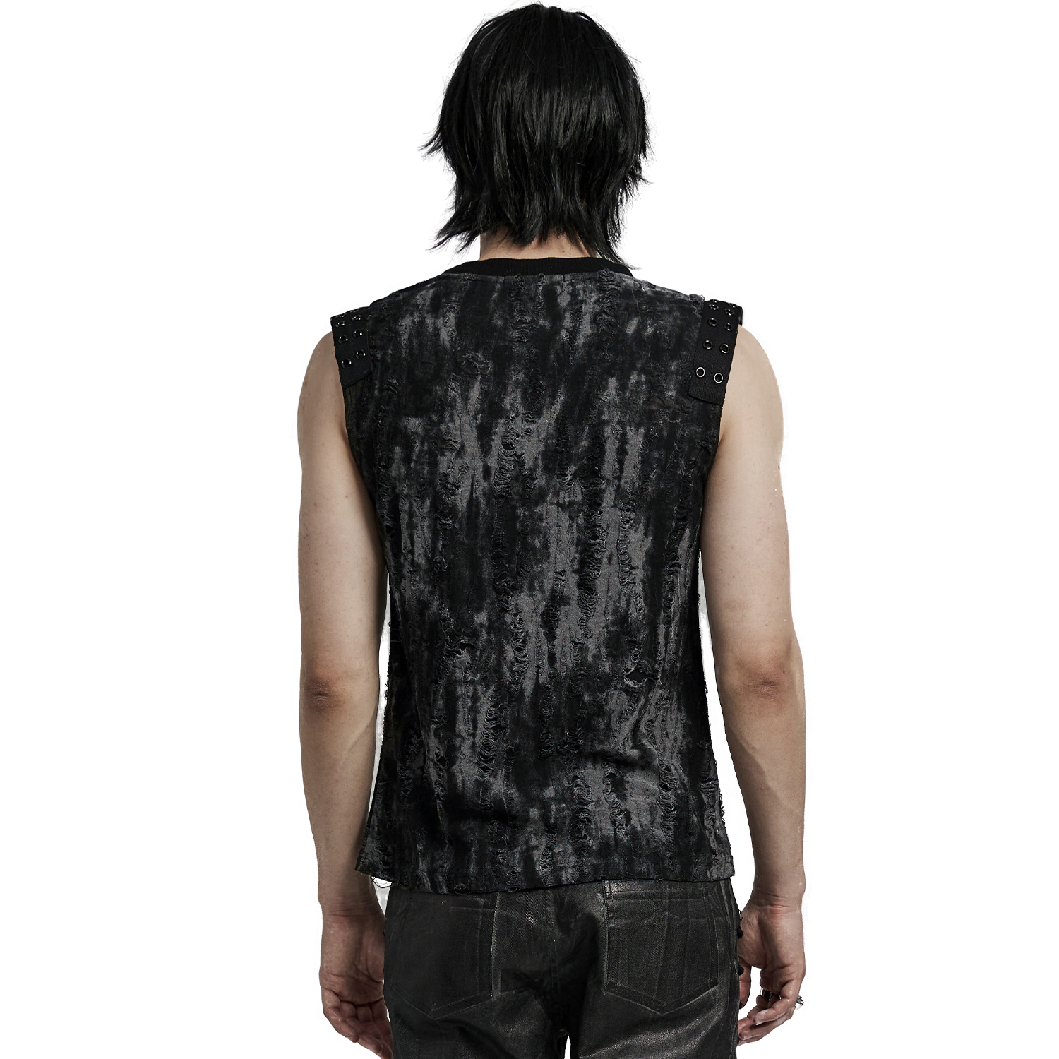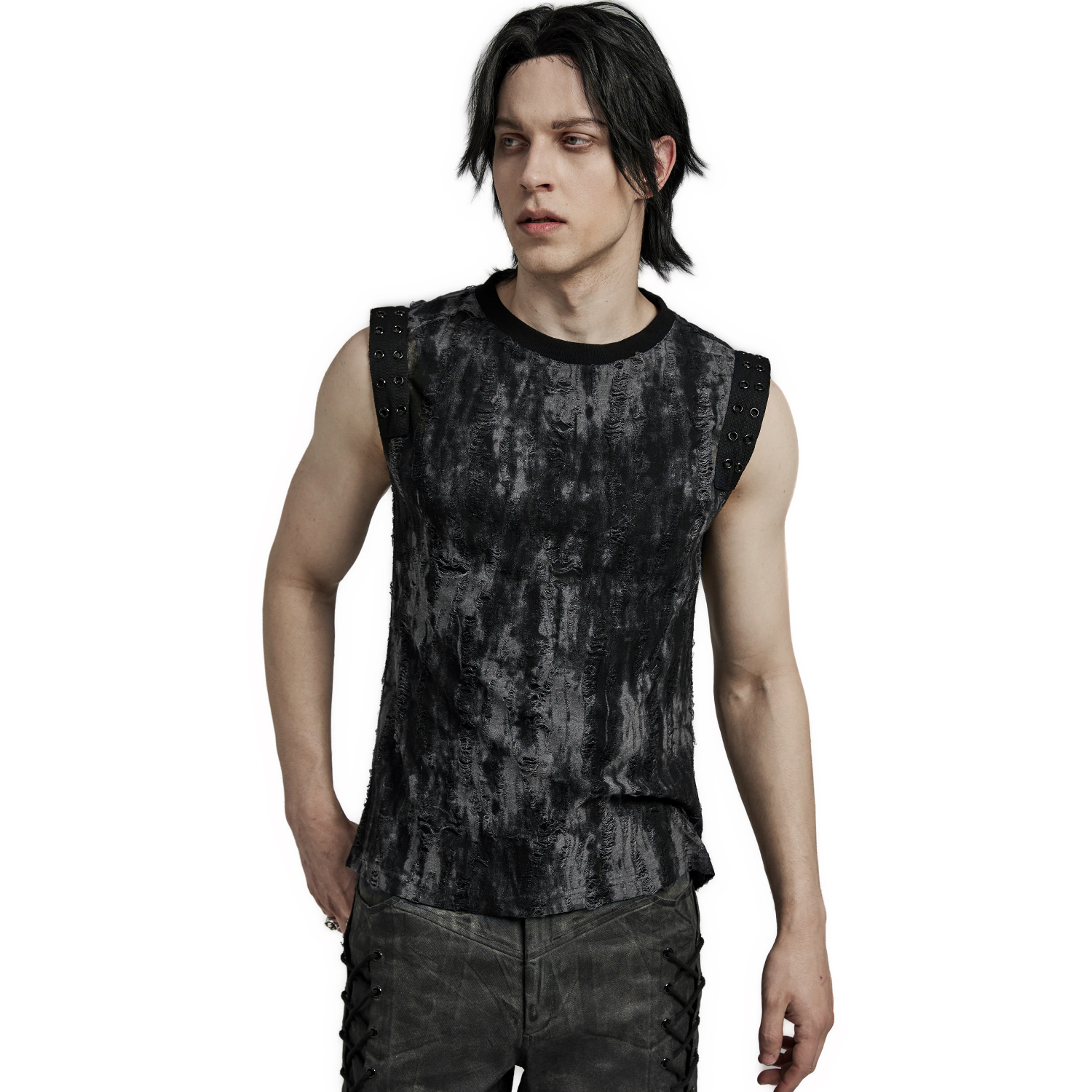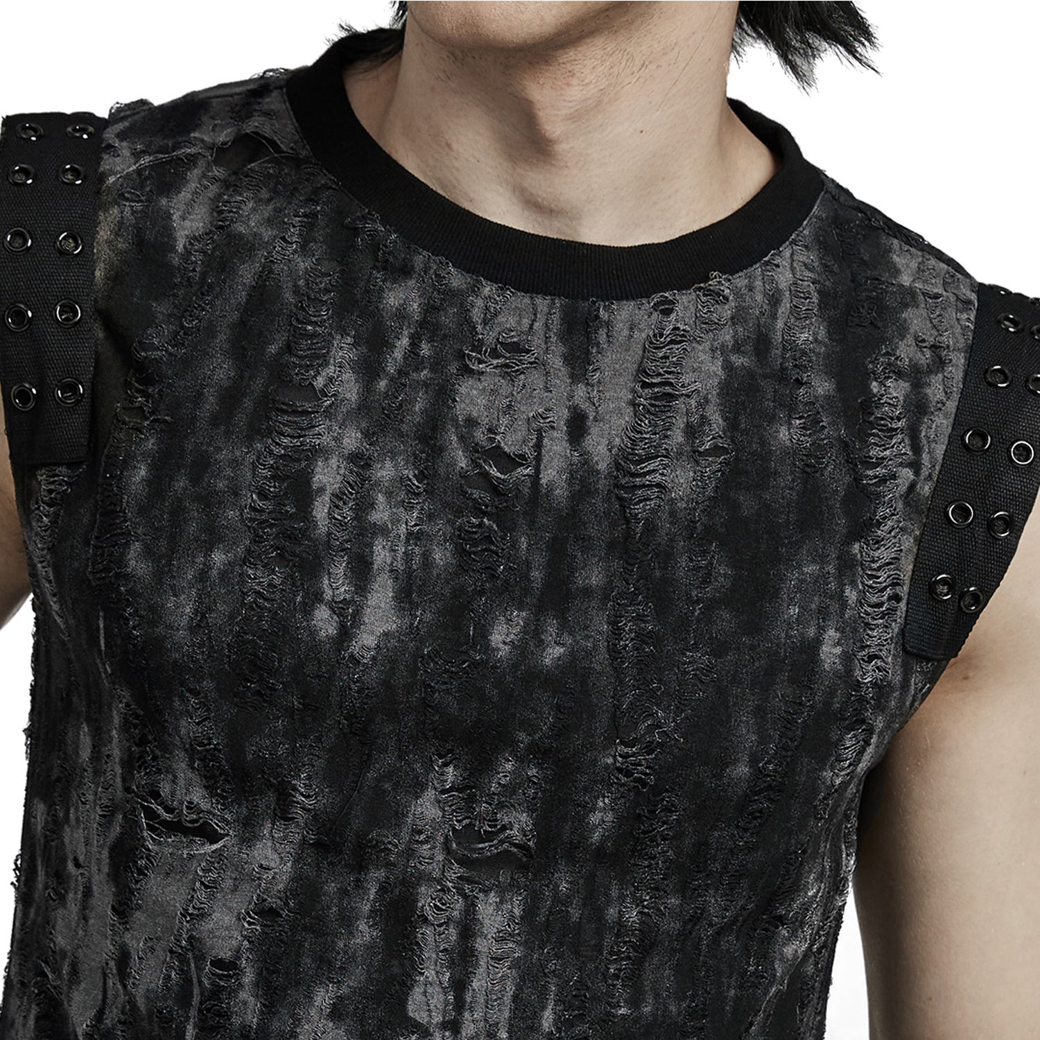 T-shirt noir sans manches pour homme, de style gothique post-apocalyptique • En tissu extensible déchiqueté • Anneau en D et laçage à l'avant. • Note : Les bordures et l'ourlet peuvent...