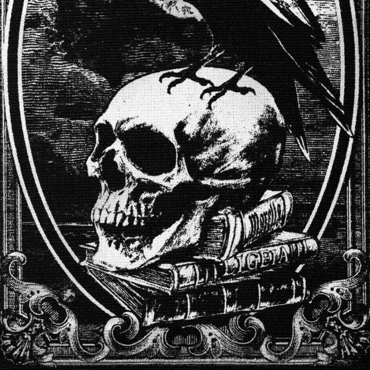 • L'œuvre d'art présente un corbeau noir, un crâne et des livres de poésie avec la lune nocturne derrière.