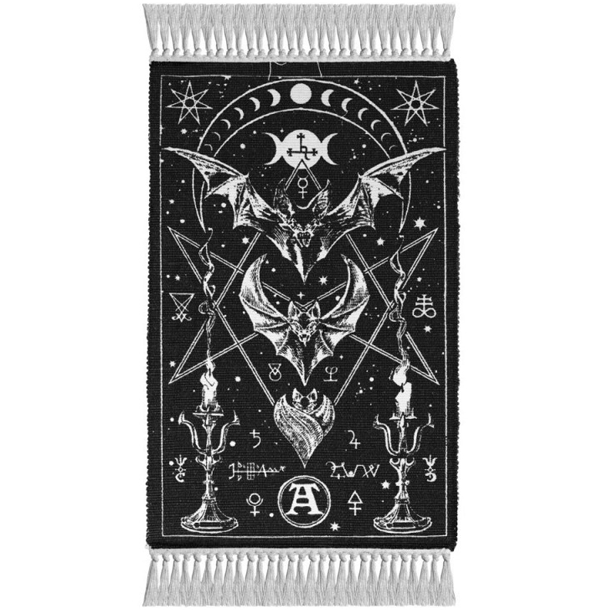• Ces éléments sont encadrés par des détails représentant les phases de la lune et des candélabres rituels, renforçant les thèmes de la transformation, des ténèbres et du symbolisme occulte.