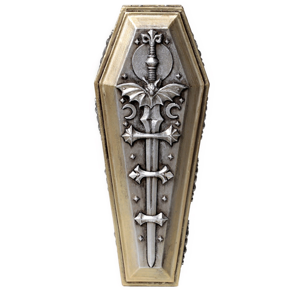 • Un cercueil décoratif, avec un motif de vampire, comprenant une épée décorée d'une poignée de chauve-souris, de pleines et de croissants de lune.