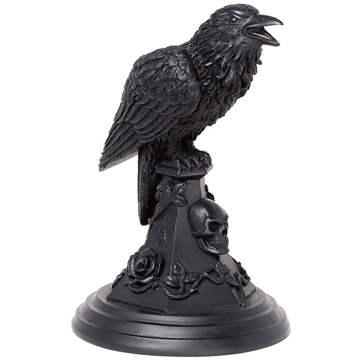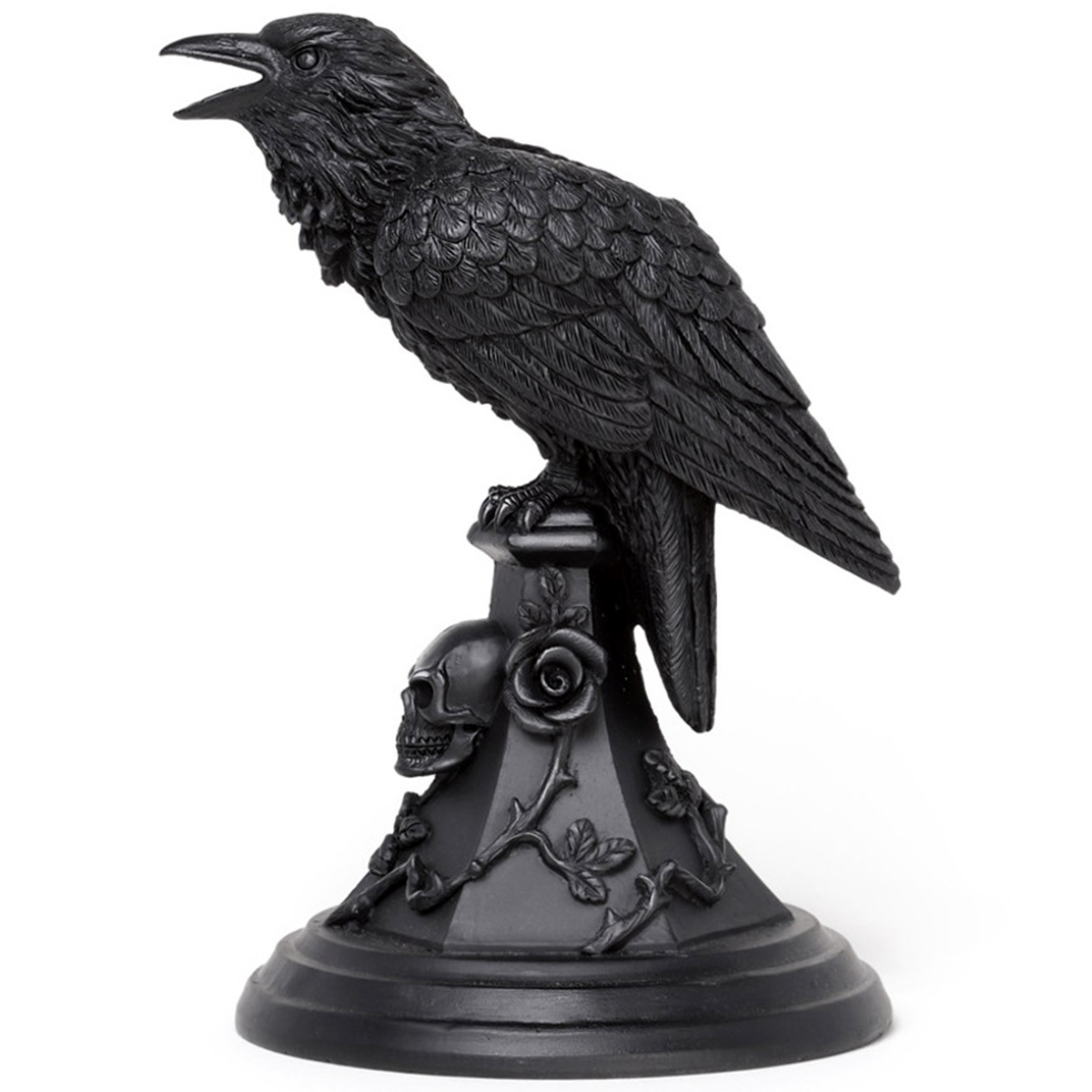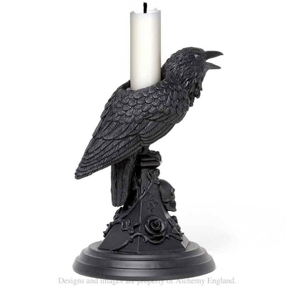 • Un bougeoir au design corbeau, roses et skull sur le socle, fini à la main dans la résine noire de la plus haute qualité.
