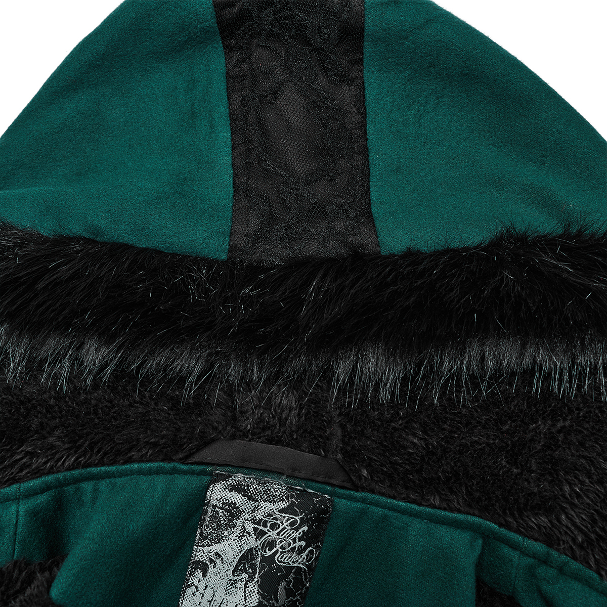 • Manteau d'hiver à capuche, bordé de fourrure synthétique souple et bordures en dentelle.