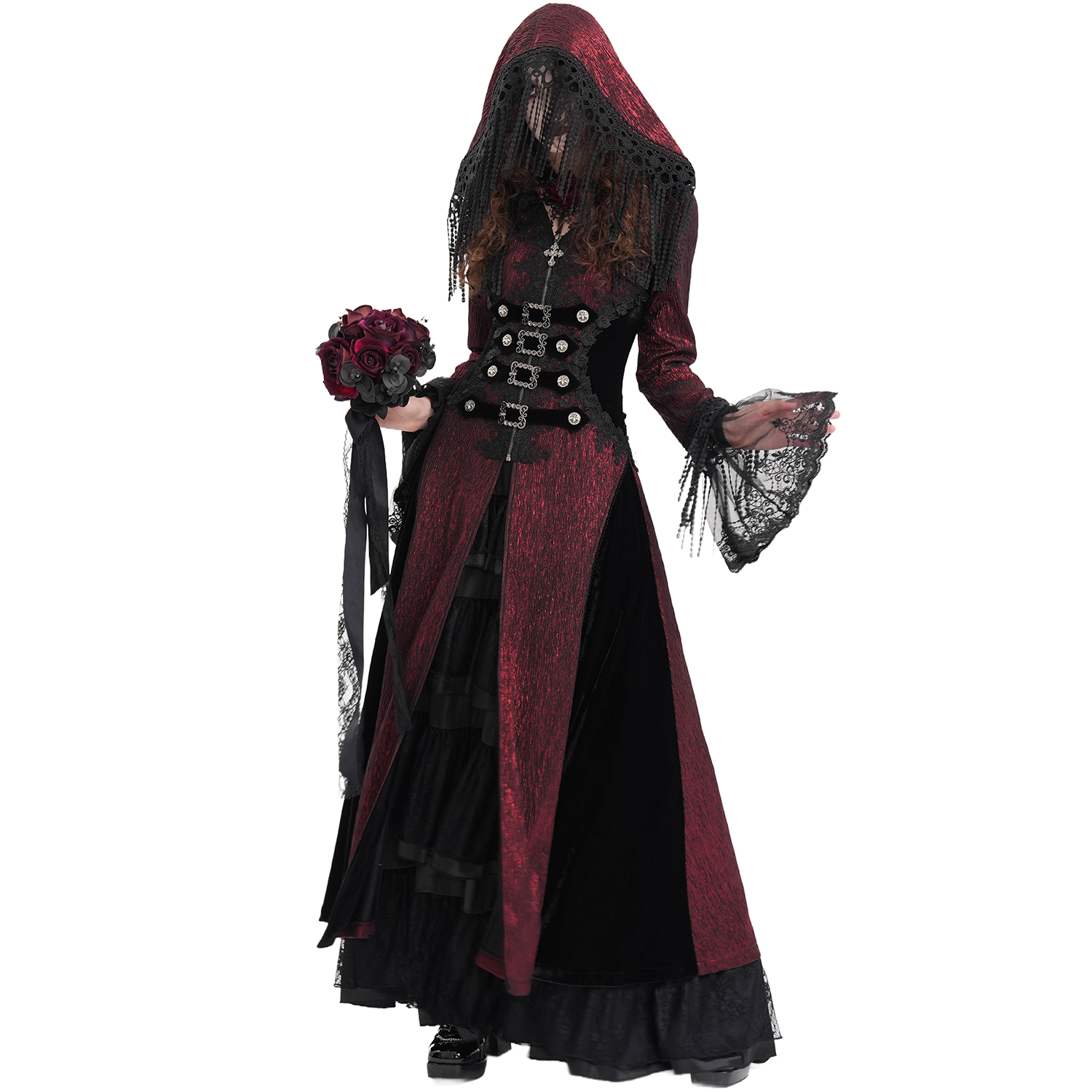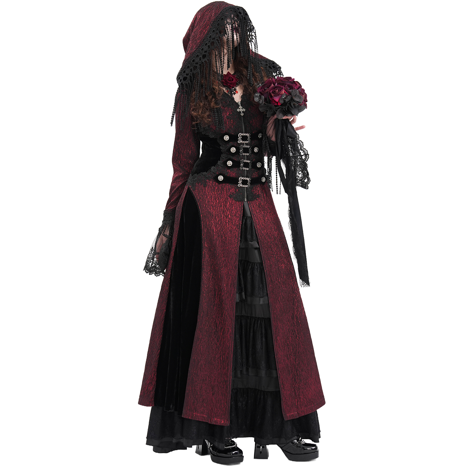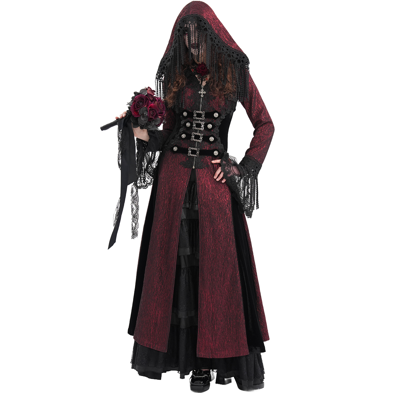 Veste longue à capuche pour femmes de style gothique, idéale pour la mi saison (printemps/automne). • Fabriquée en laine peignée noire avec un matériau de stratification mat • Épaule avec...