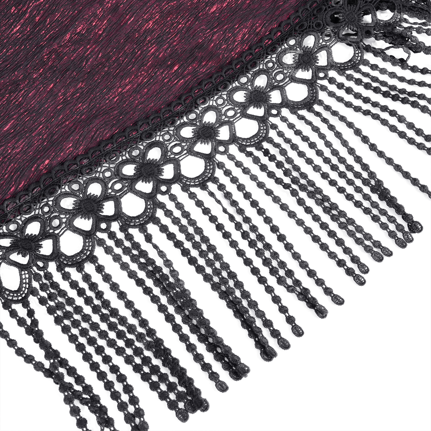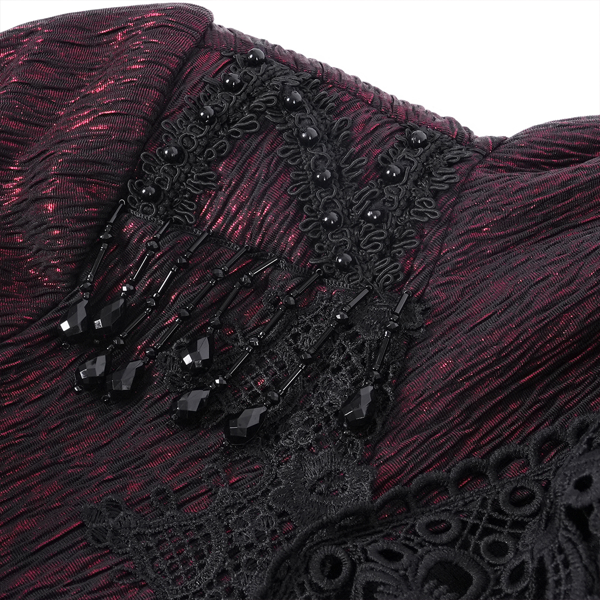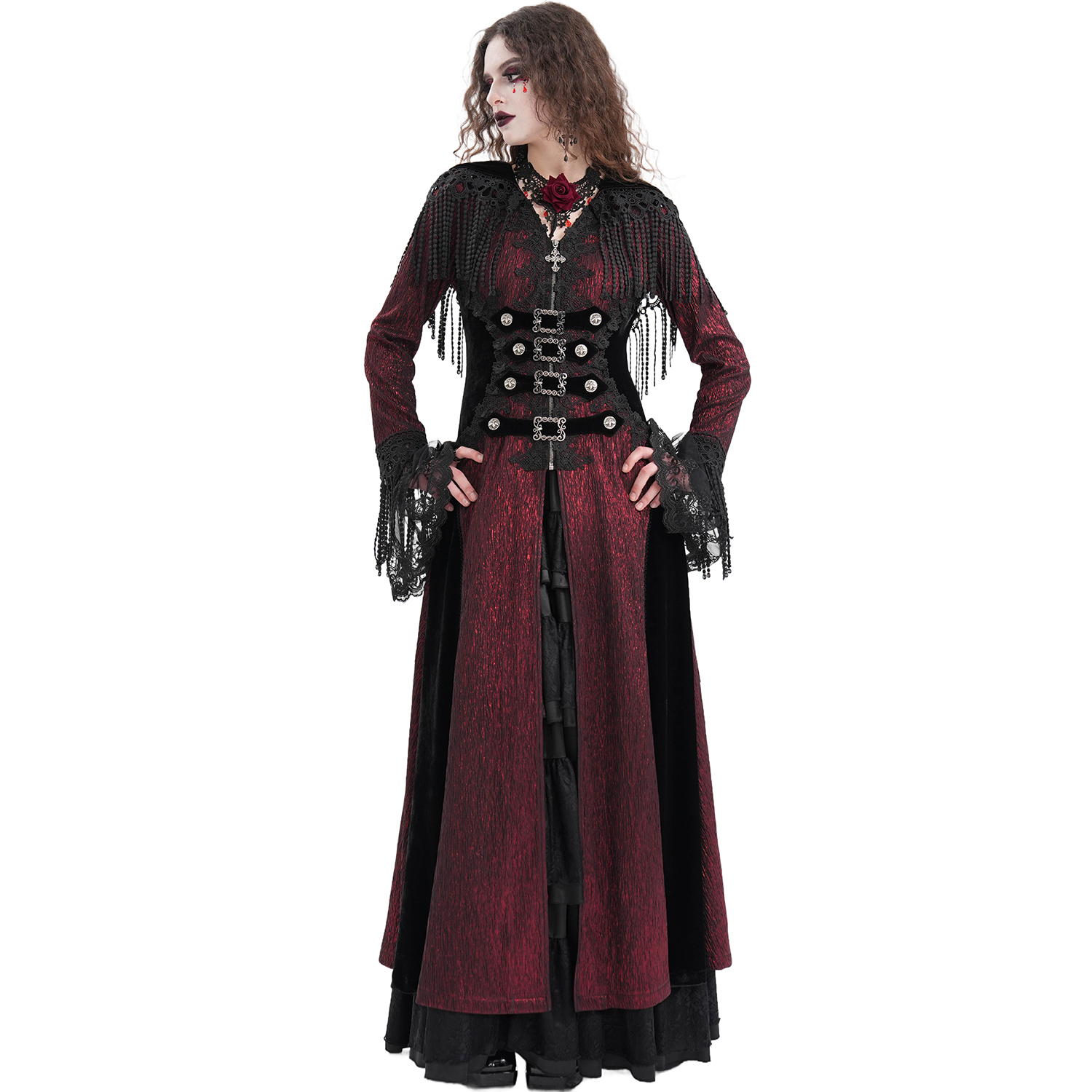 • En velours rouge avec une broderie en dentelle. • Fermeture boutonnée sur le devant avec col haut • Riches ornements en dentelle brodée sur les deux côtés • Dos lacé avec un ruban en velours...