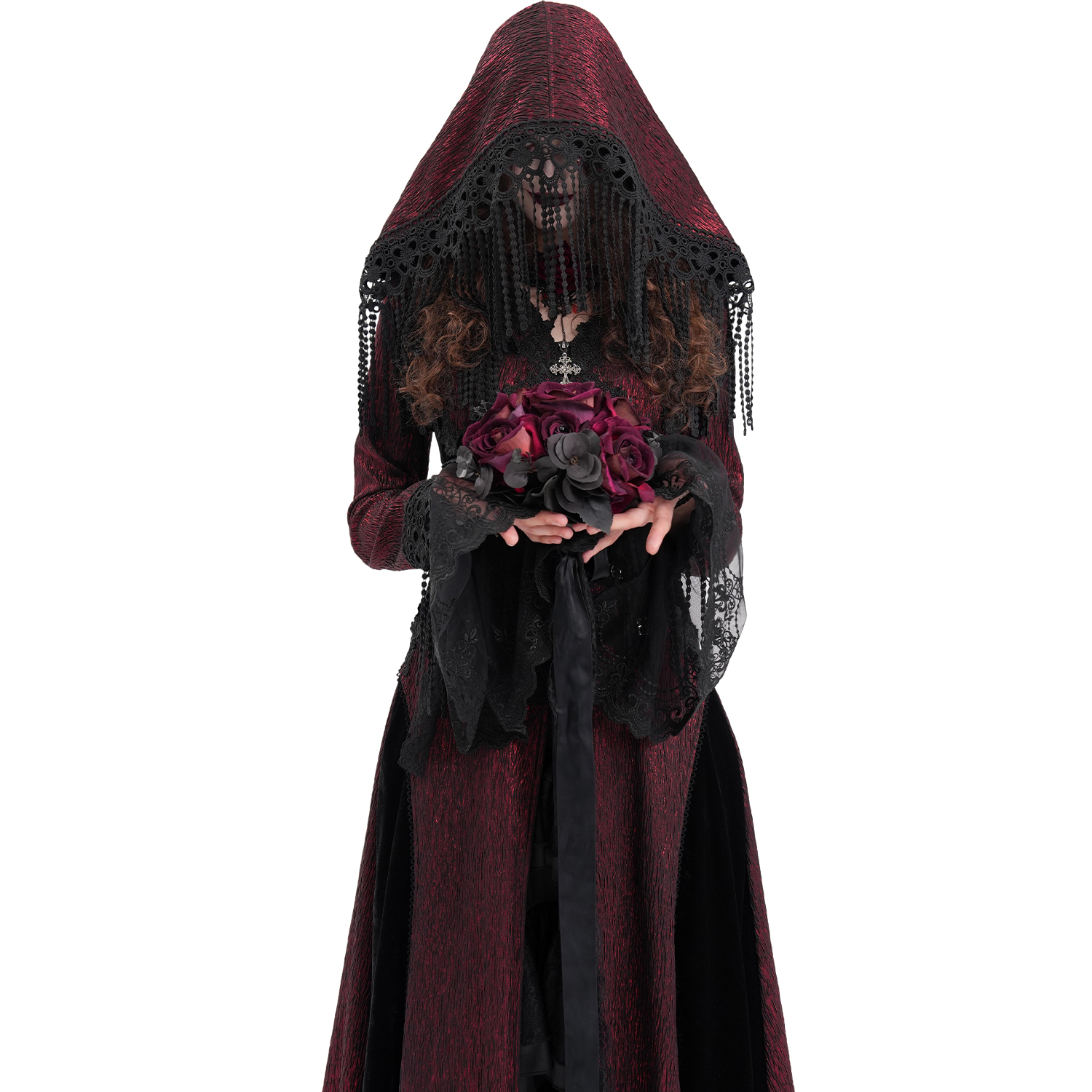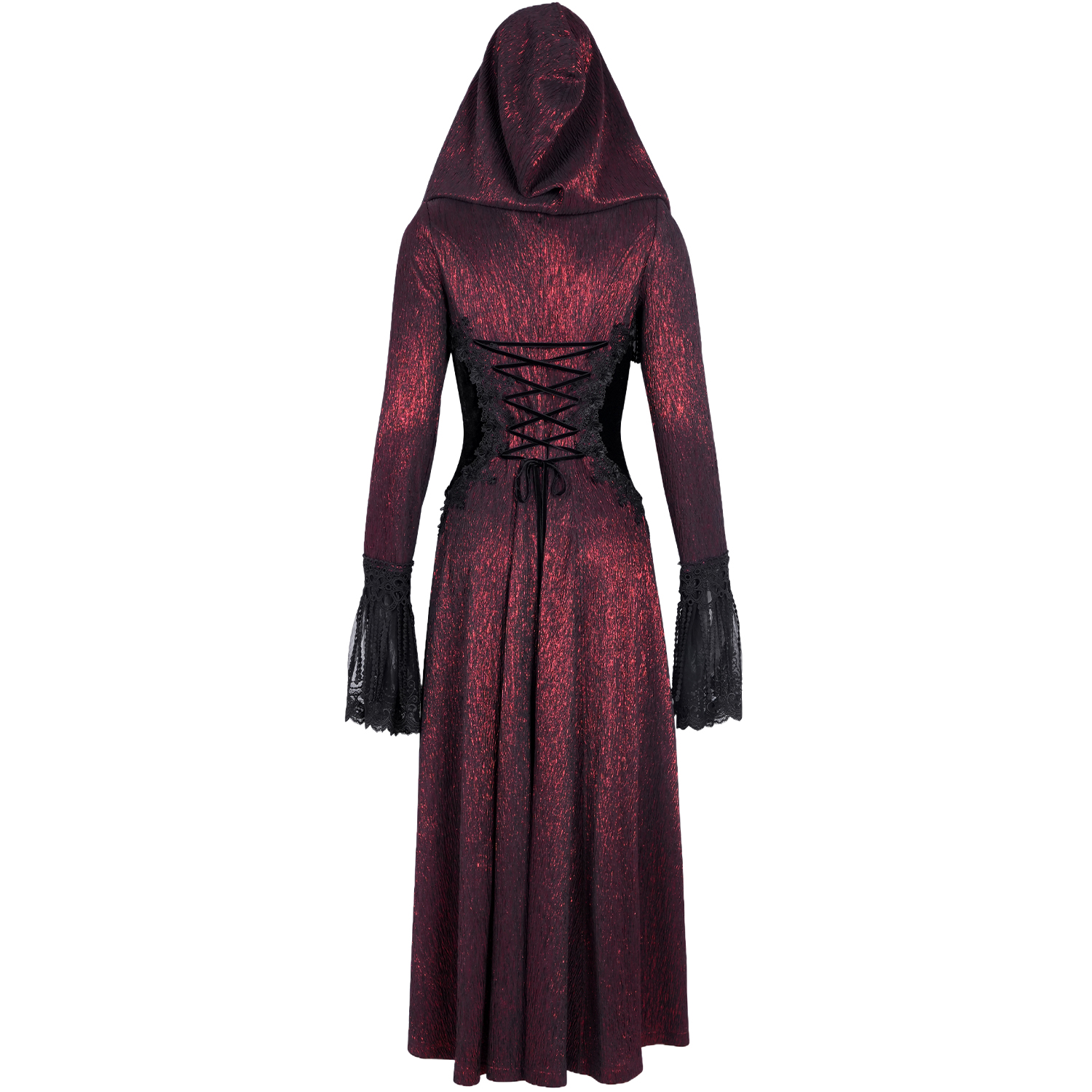• En velours luxueux, dense et confortable • Dégradé de couleurs du noir au rouge à l'ourlet • Grande capuche avec une fine dentelle noire sur les bords • Fentes pour les bras bordées de...