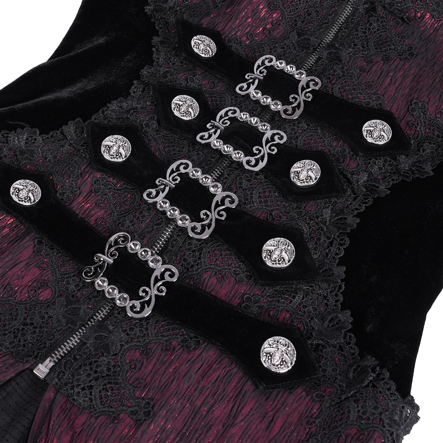 Veste rouge gothique pour femme décorée de détails en cuir végétal synthétique, de tissu en résille, de fermetures à glissière et d'œillets à clous. • La matière principale ressemble à du cuir...