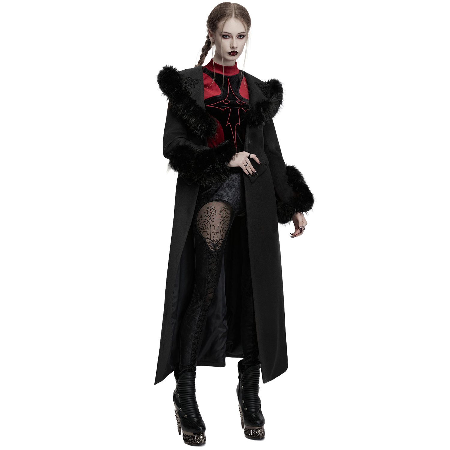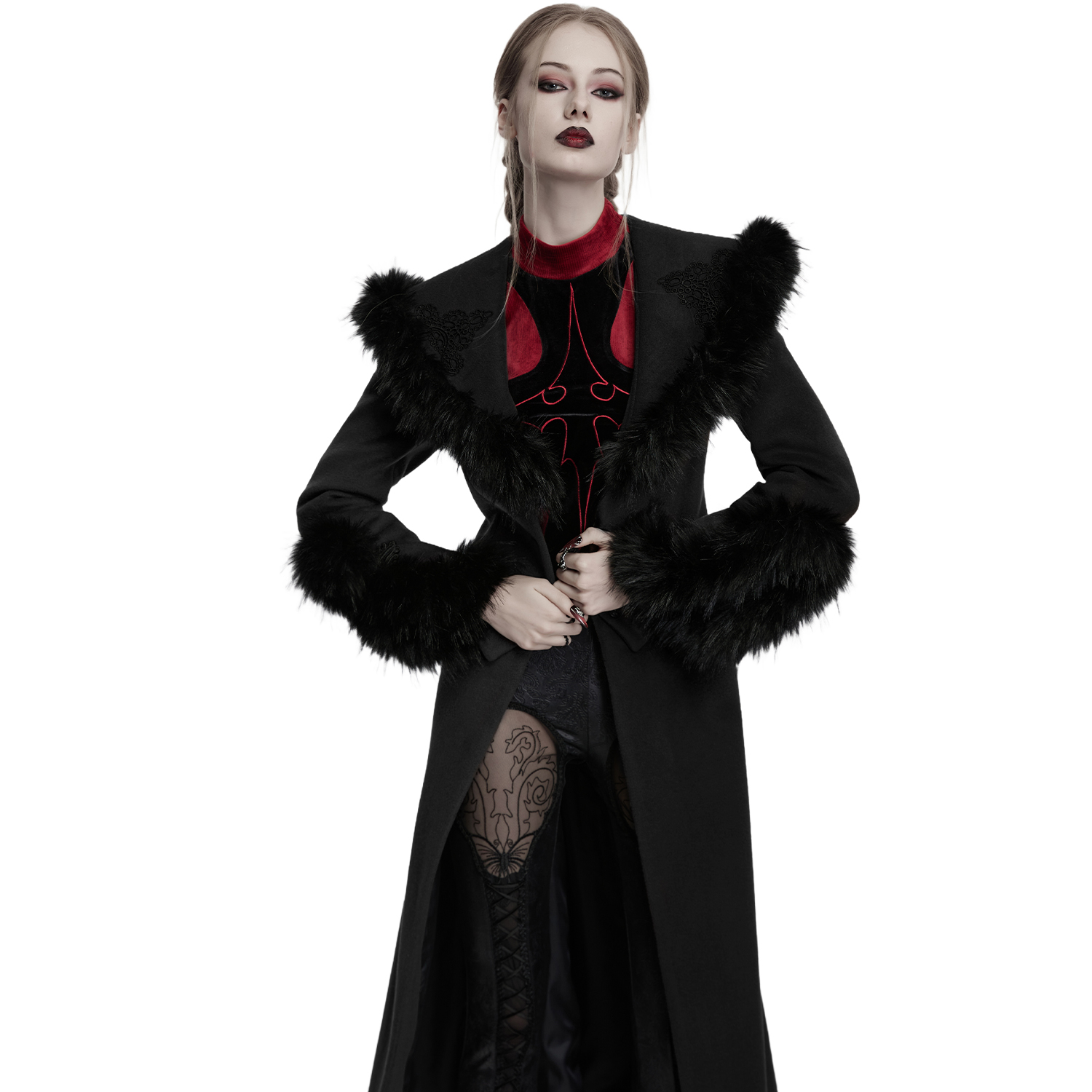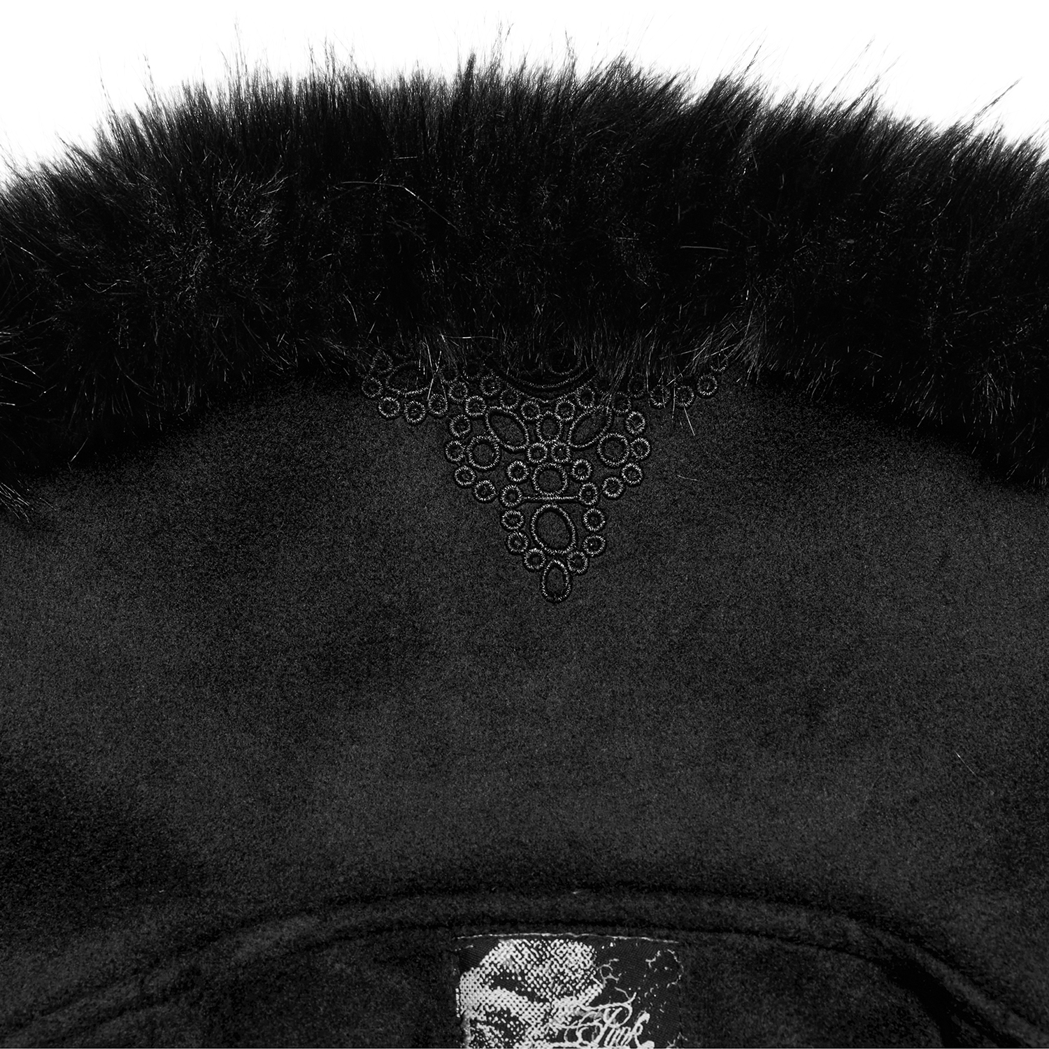 • Col et manches bordés de fausse fourrure noire et ornés d'un élégant motif