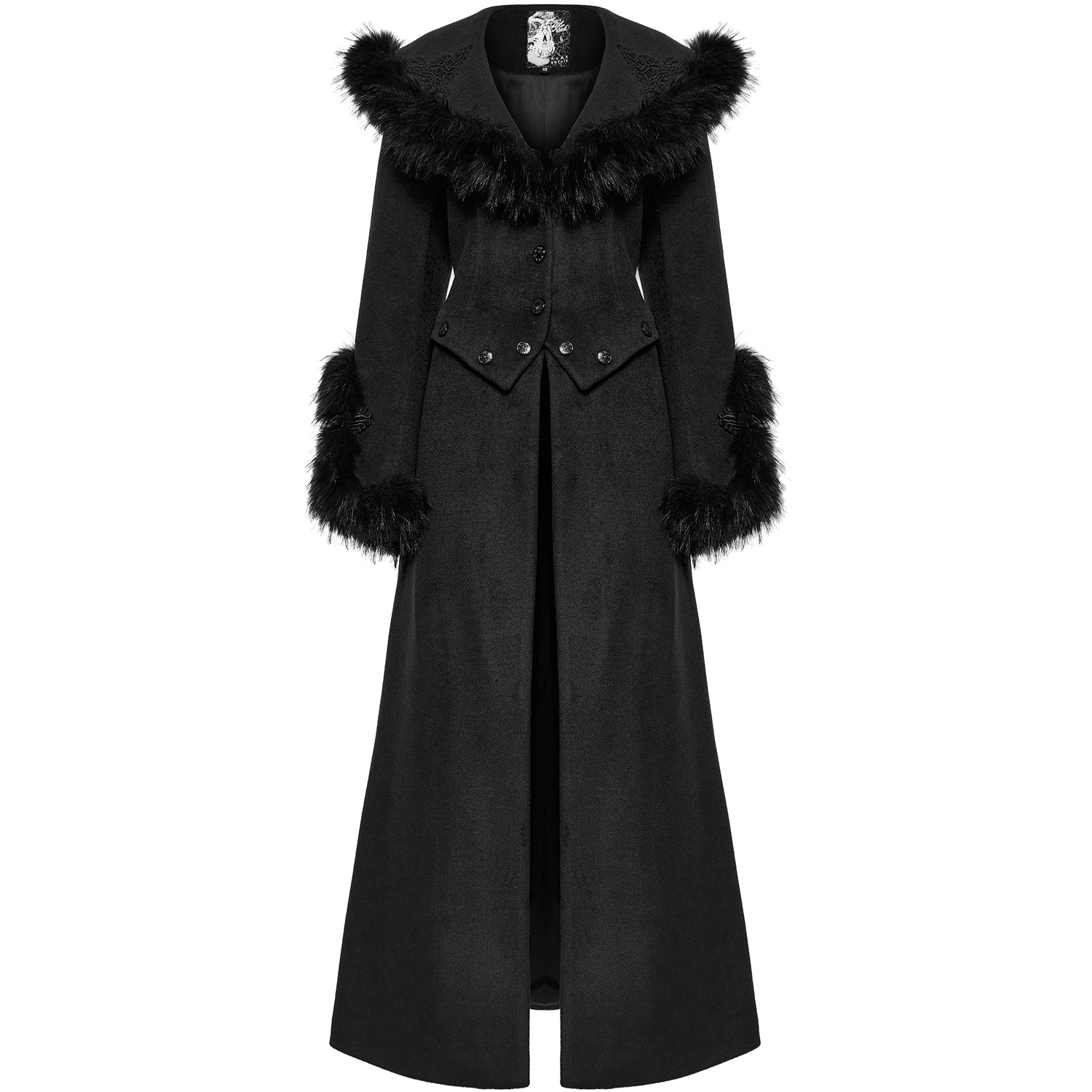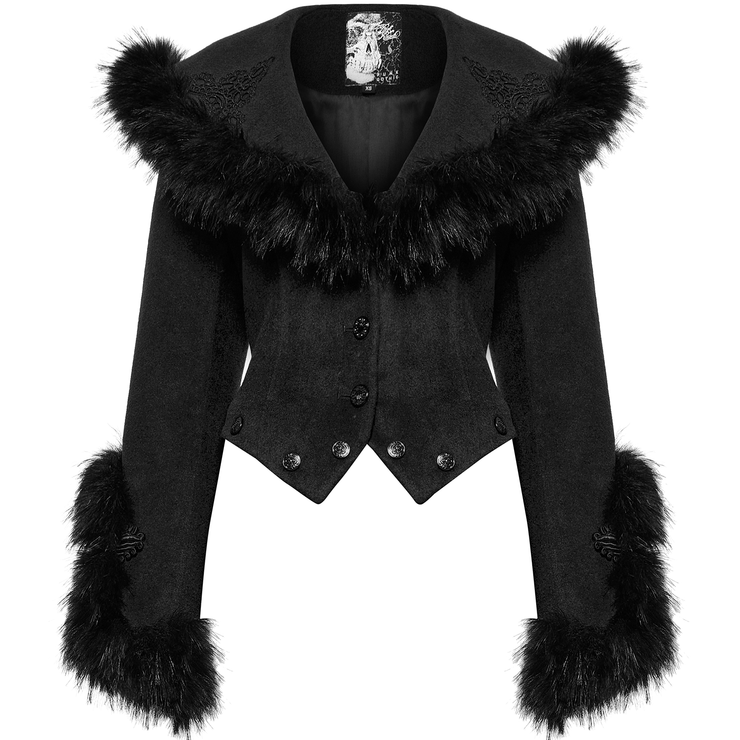 • En laine noire épaisse et de haute qualité • Col et manches bordés de fausse fourrure noire et ornés d'un élégant motif • Ourlet amovible, peut se porter en veste courte • Fermeture boutonnée •...