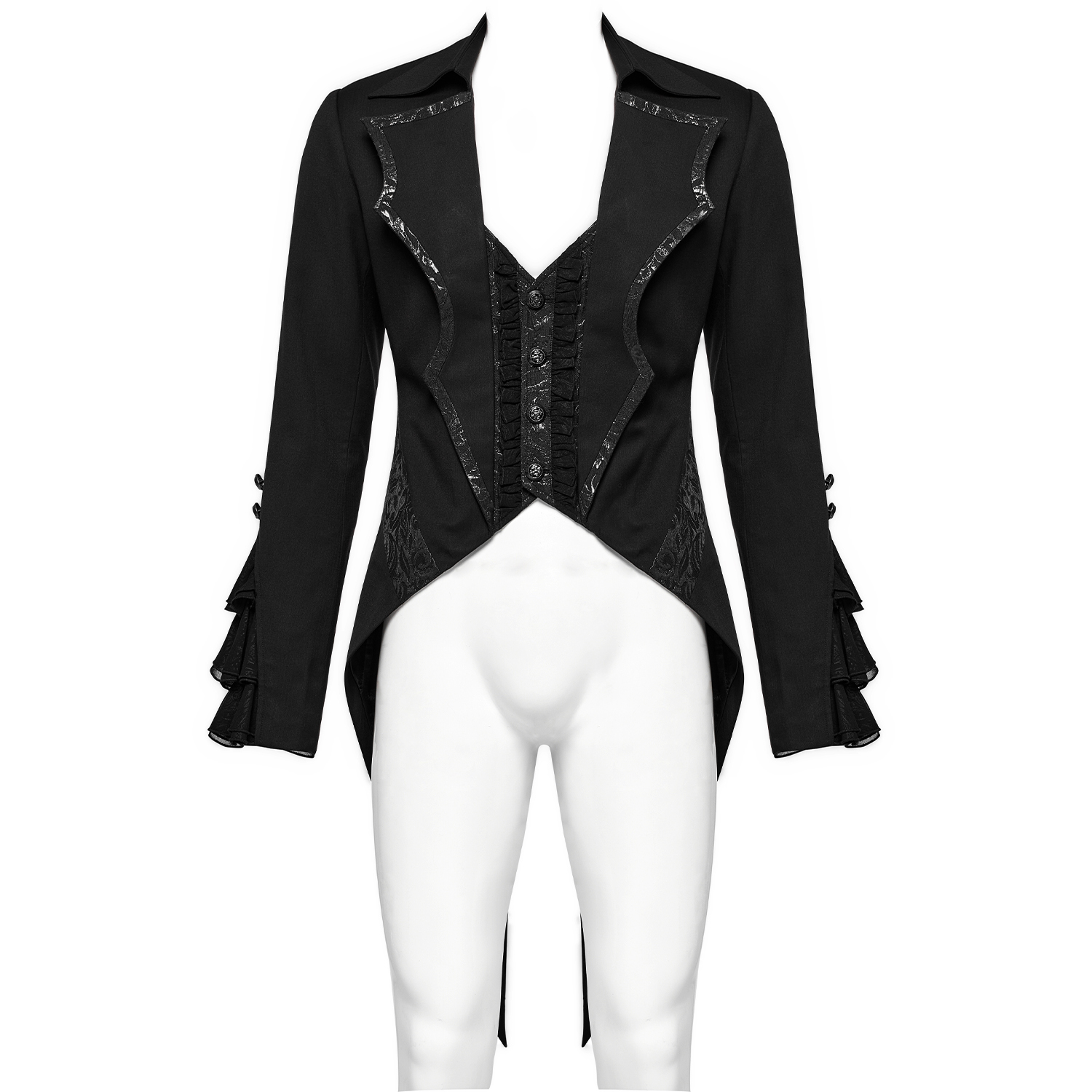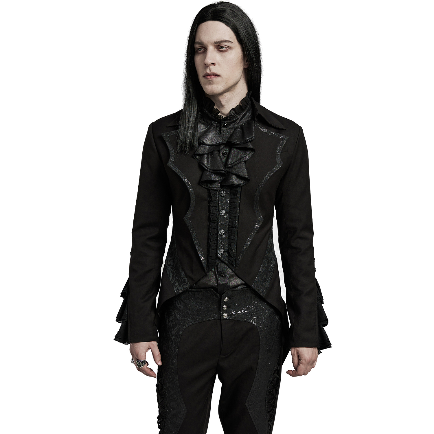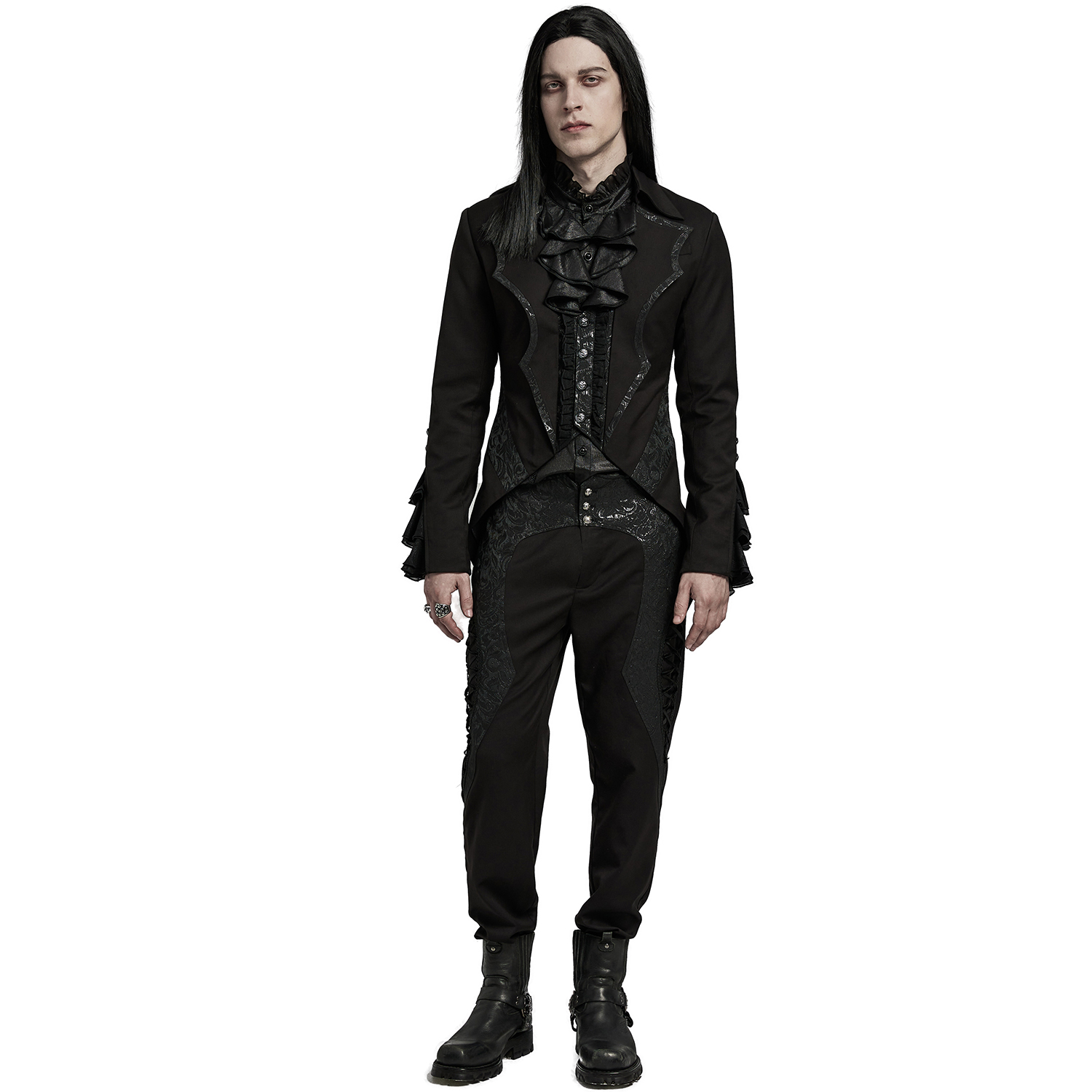 Manteau gothique pour hommes • En similicuir PU avec effet vieilli et tissu noirs • Col rond style mandarin • Fermeture à glissière apparente • Tirette métallique personnalisée au logo de la...